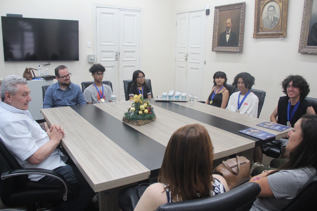 Prefeito Ceron recebe vencedores da Olimpíada Brasileira de Geografia e finalistas do Prêmio Nacional da Educação Fiscal