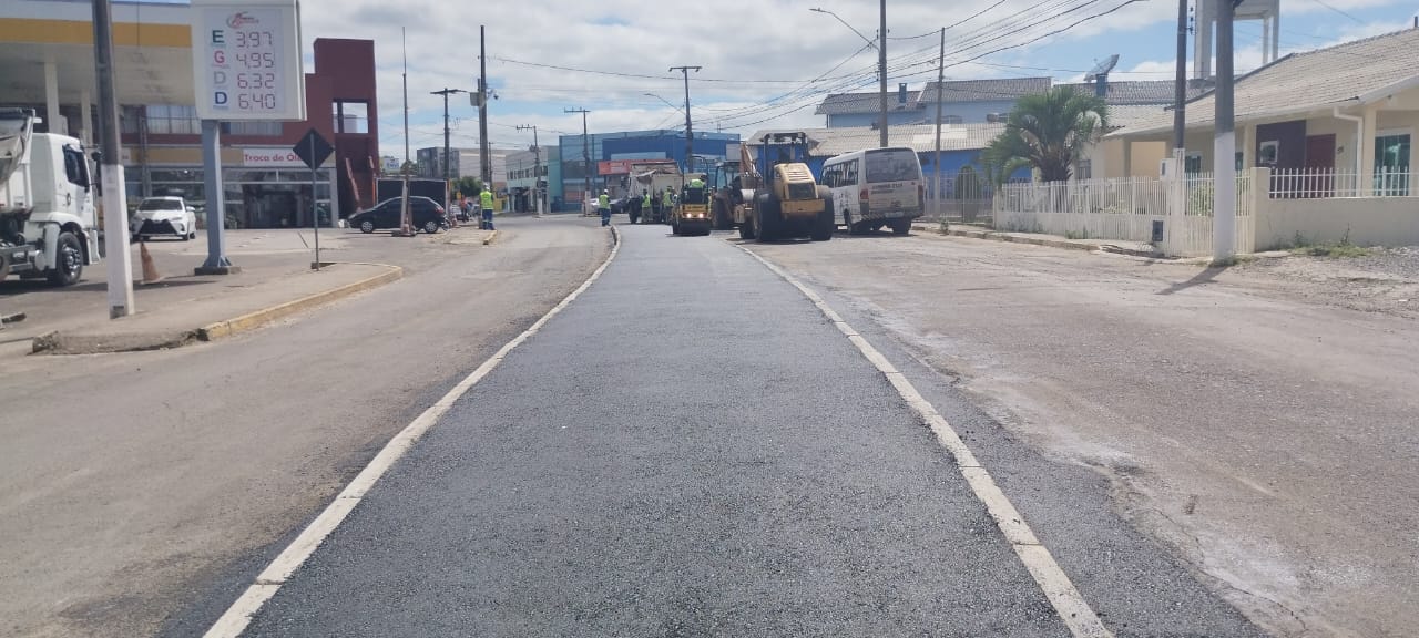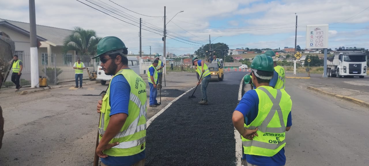 A equipe de serviços da Secretaria de Obras, da Prefeitura de Lages, trabalha na implantação de uma ciclofaixa na avenida 31 de Março, no bairro Guarujá.
