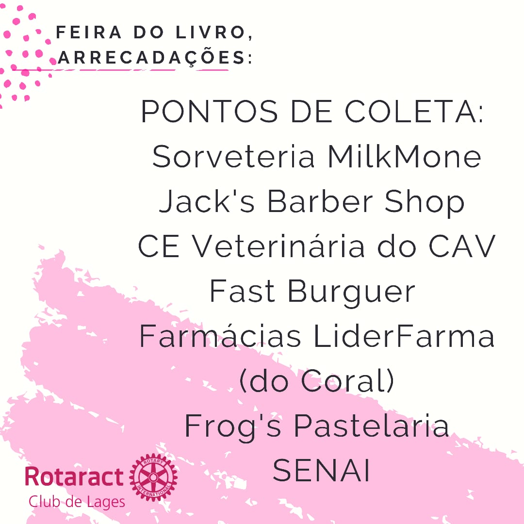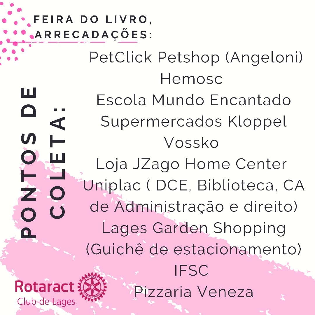 A Feira, organizada e executada pelo Rotaract Club de Lages, funciona através da compra de livros, ou a troca de pacotes de ração por livros, todos títulos doados voluntariamente. Em 2018 o total arrecadado foi de R$ 2.325,00, com 700 livros vendidos e 475 quilos de ração que foram destinados ao programa Adote Lages. Desta vez, a feira será em dois dias, 14 e 15 de setembro, das 9h às 15h, com atividades no Tanque e na Biblioteca Municipal.