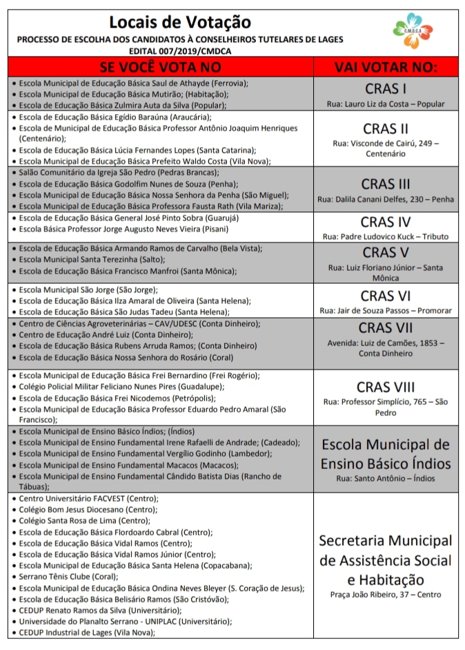 No dia 6 de outubro (domingo), no período entre 8h e 17h, sem intervalos, os cidadãos de Lages poderão escolher os cinco membros do Conselho Tutelar de Lages, com mandato entre 10 de janeiro de 2020 e 9 de janeiro de 2024. São 16 candidatos.