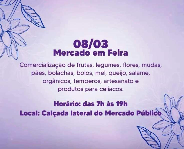 Nesta quarta-feira, Dia Internacional da Mulher (8 de Março), tem uma atividade especial no Mercado Público de Lages, com a comercialização de frutas, legumes, flores, mudas, pães, bolachas, bolos, mel, queijo, salame, orgânicos, temperos, artesanato e produtos para celíacos.