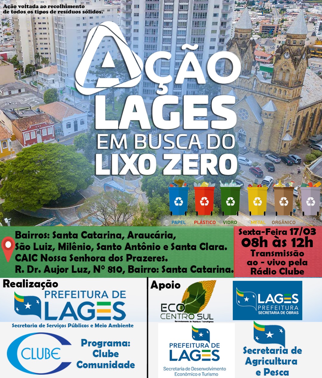 A Secretaria de Serviços Públicos e Meio Ambiente desenvolverá a ação “Lages em Busca do Lixo Zero”, que prevê o recolhimento de entulhos, galhos, materiais eletrônicos em desuso e qualquer outro tipo de resíduo sólido. Será realizada também a distribuição de mudas de árvores nativas.