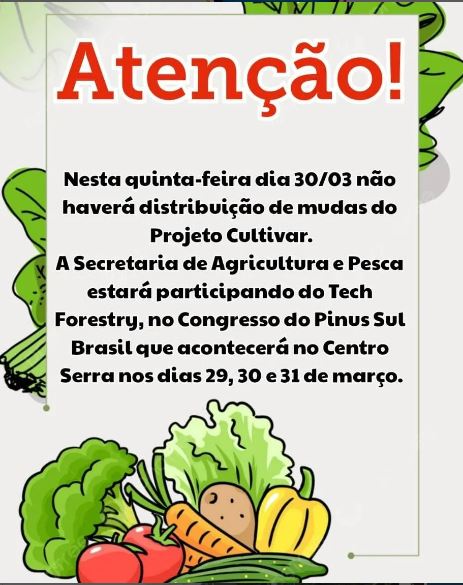Nesta quinta-feira (30) a Prefeitura de Lages não estará realizando ação do Projeto Cultivar, na sede da Secretaria de Agricultura e Pesca, no Bairro Universitário.
