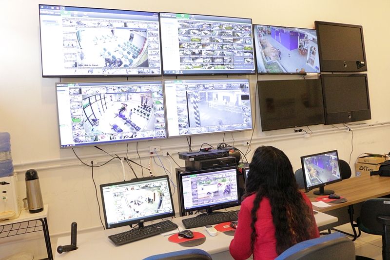 Na central de videomonitoramento a equipe da Secretaria de Segurança fica 24 horas por dia no monitoramento destas unidades de ensino