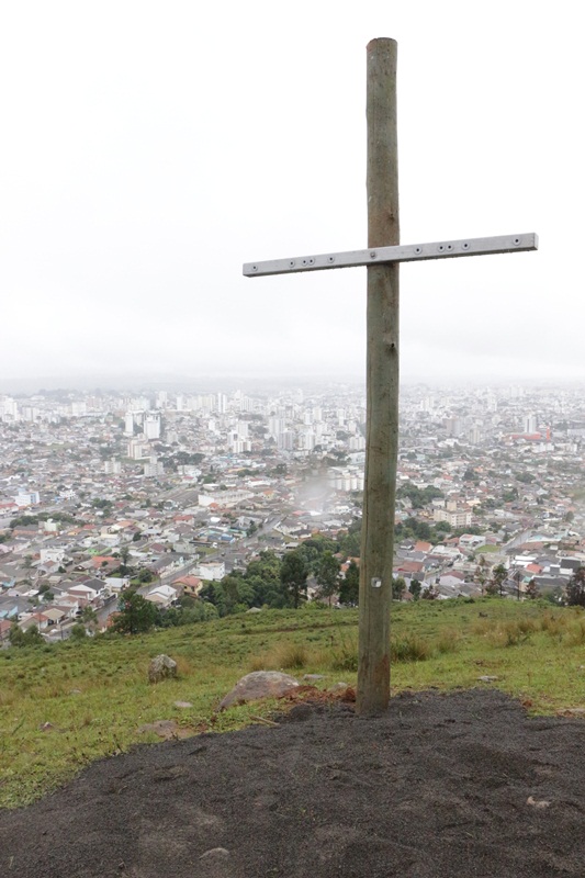 Mesmo com o tempo chuvoso os fiéis estão presentes no alto do Morro da Cruz em Lages para suas orações e devoções