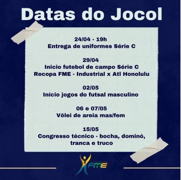 O Jocol está quase começando e dia 24 já tem a entrega dos uniformes para as equipes da Série C. Os times devem comparecer na FME para retirar o material.