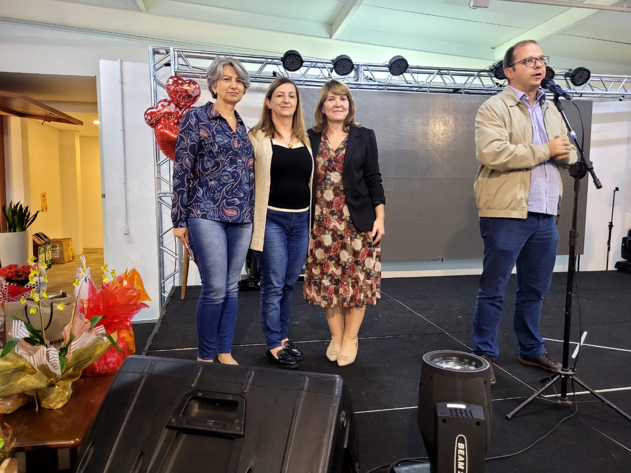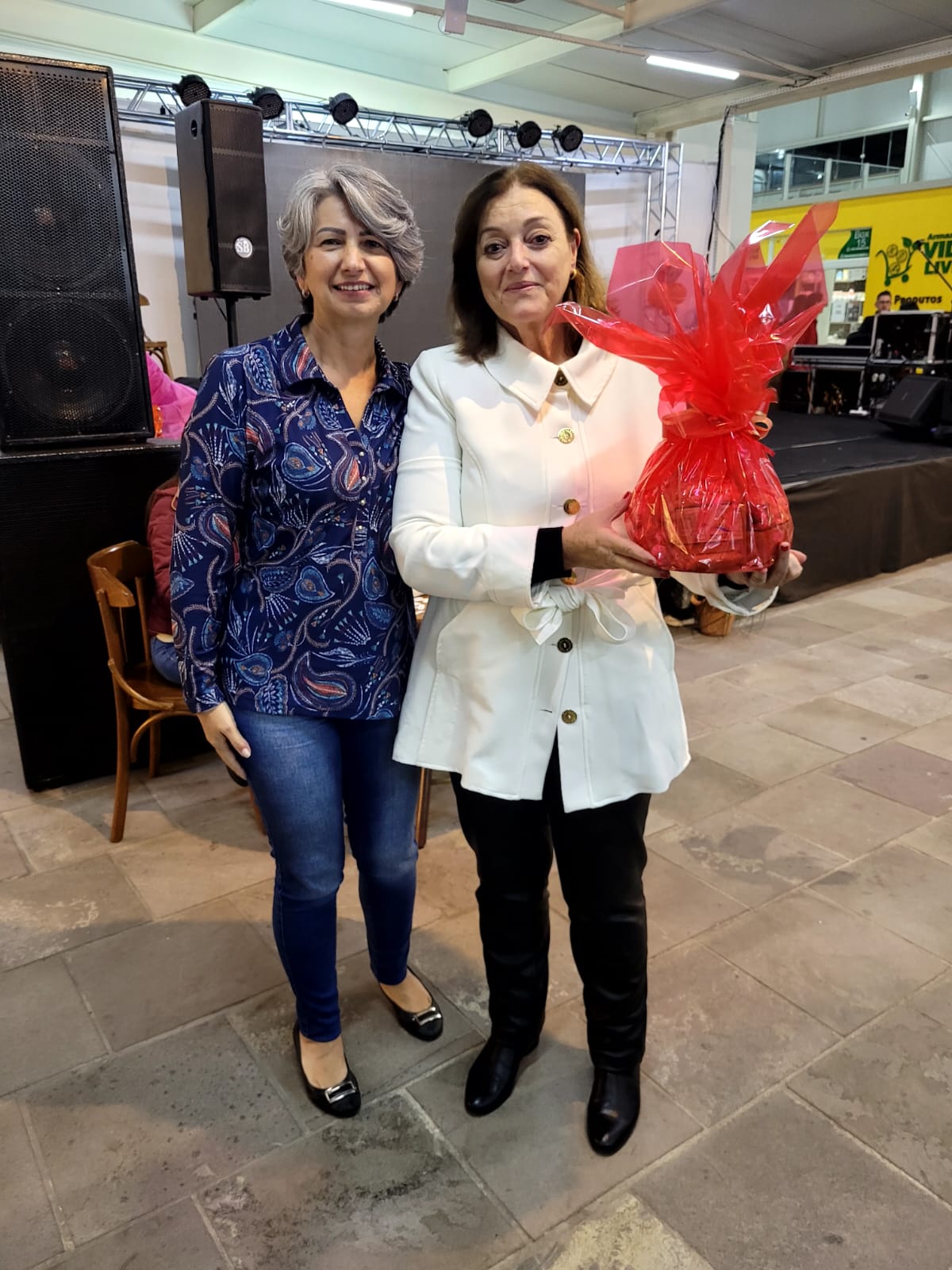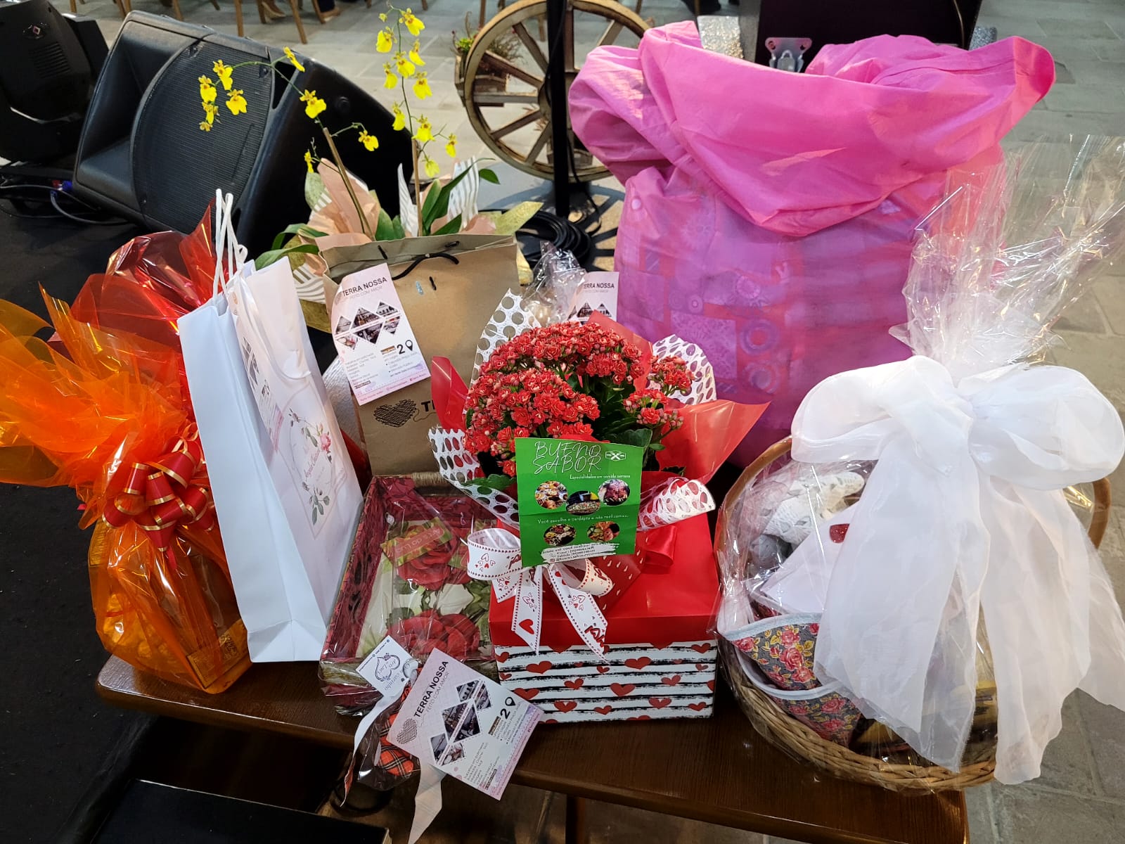 Entre os brindes entregues na noite desta segunda-feira (8 de maio) estavam extensão de cílios, por Estúdio Rosane Machado; limpeza de pele, por Studio Naiara Matos; duas sessões de massagem relaxante, por Clínica de Estética Magrass; produtos Mary Kay, por Naiara Ventura; detox e avaliação personalizada gratuitos, combos com desconto (spa em dobro) e vale presente, por Clínica Estética Virtuosa; um bolo de Dia das Mães, por Janine Bolos e Doces; um bolo, por Armazém Vida Livre; duas cestas de itens pastifícios e dois pães, pelo box da Agricultura Familiar; um vaso de flores, por Floricultura Sequoia, e artigos de artesanato doados pelas quatro unidades da loja Terra Nossa.