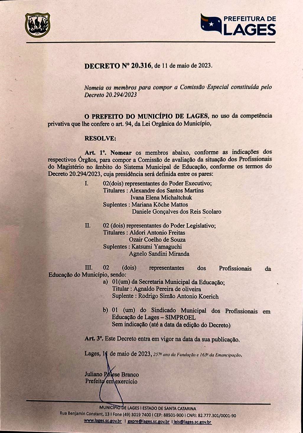 O prefeito em exercício Juliano Polese assinou o Decreto n° 20.316, que nomeou os membros de Comissão para a Comissão de Avaliação da situação dos Profissionais do Magistério no âmbito do Sistema Municipal de Educação