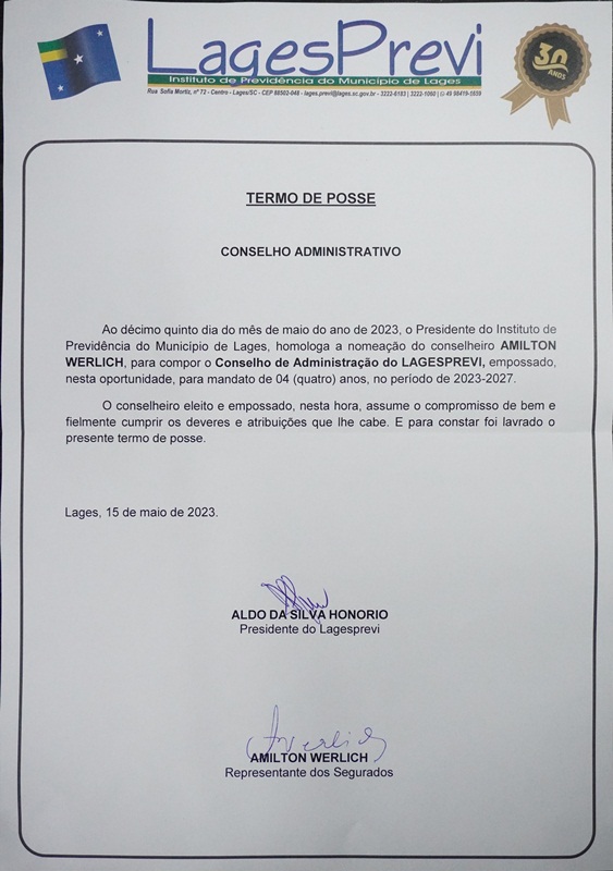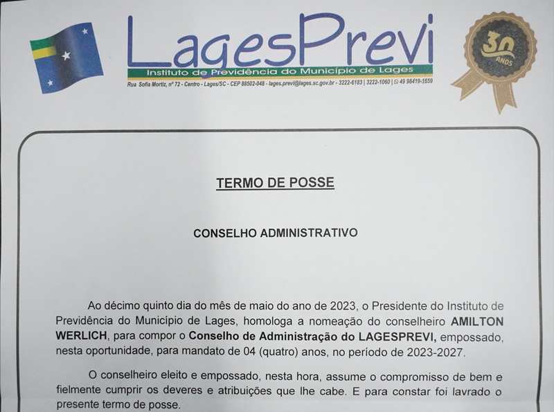 “Neste ano de 2023, o LagesPrevi completa 30 anos de atividades em prol dos servidores públicos municipais de Lages, e só temos a agradecer o trabalho voluntário de todos os conselheiros, sejam aqueles que já atuaram ou aqueles que a partir de agora formam o Conselho Administrativo e Fiscal do LagesPrevi”, destaca o presidente do Instituto, Aldo Onório.