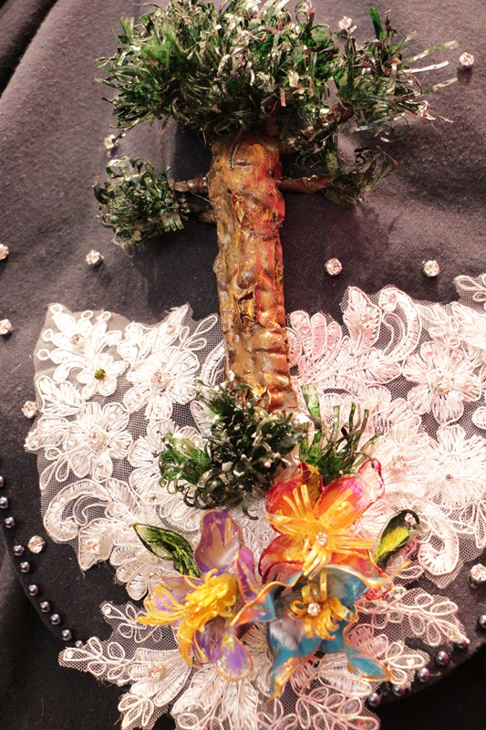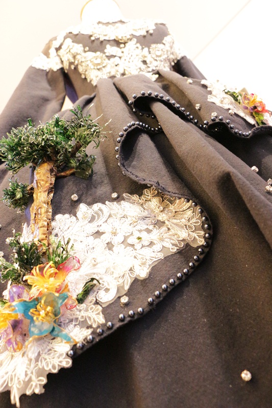 Todos os ornamentos do vestido são feitos de garrafas pets, desde as flores até as araucárias, compondo com rendas brancas e bordados em pedrarias. A ideia é realmente lembrar a geada serrana e o brilho reluzente nos primeiros raios de sol da manhã. A cor, azul marinho, em um tom forte e mais fechado, remete ao céu escuro do entardecer.