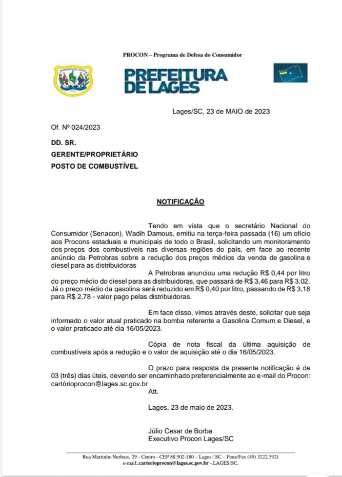 Assim, nesta semana foi desencadeada uma ação de verificação nos postos de combustíveis de Lages, para verificar se essa redução estabelecida pela Petrobras passou a ser praticada, em benefício ao consumidor, destacou o Executivo do Procon de Lages, Júlio Borba.