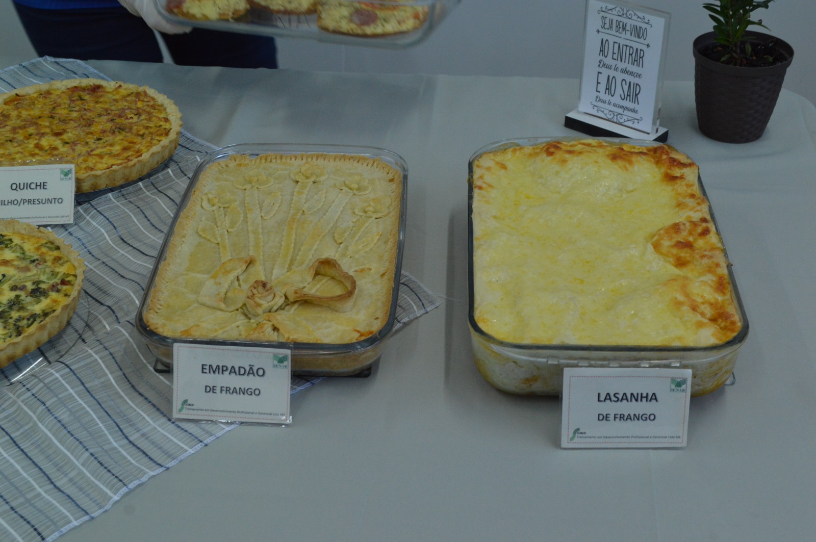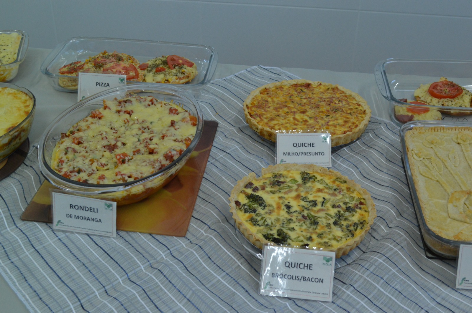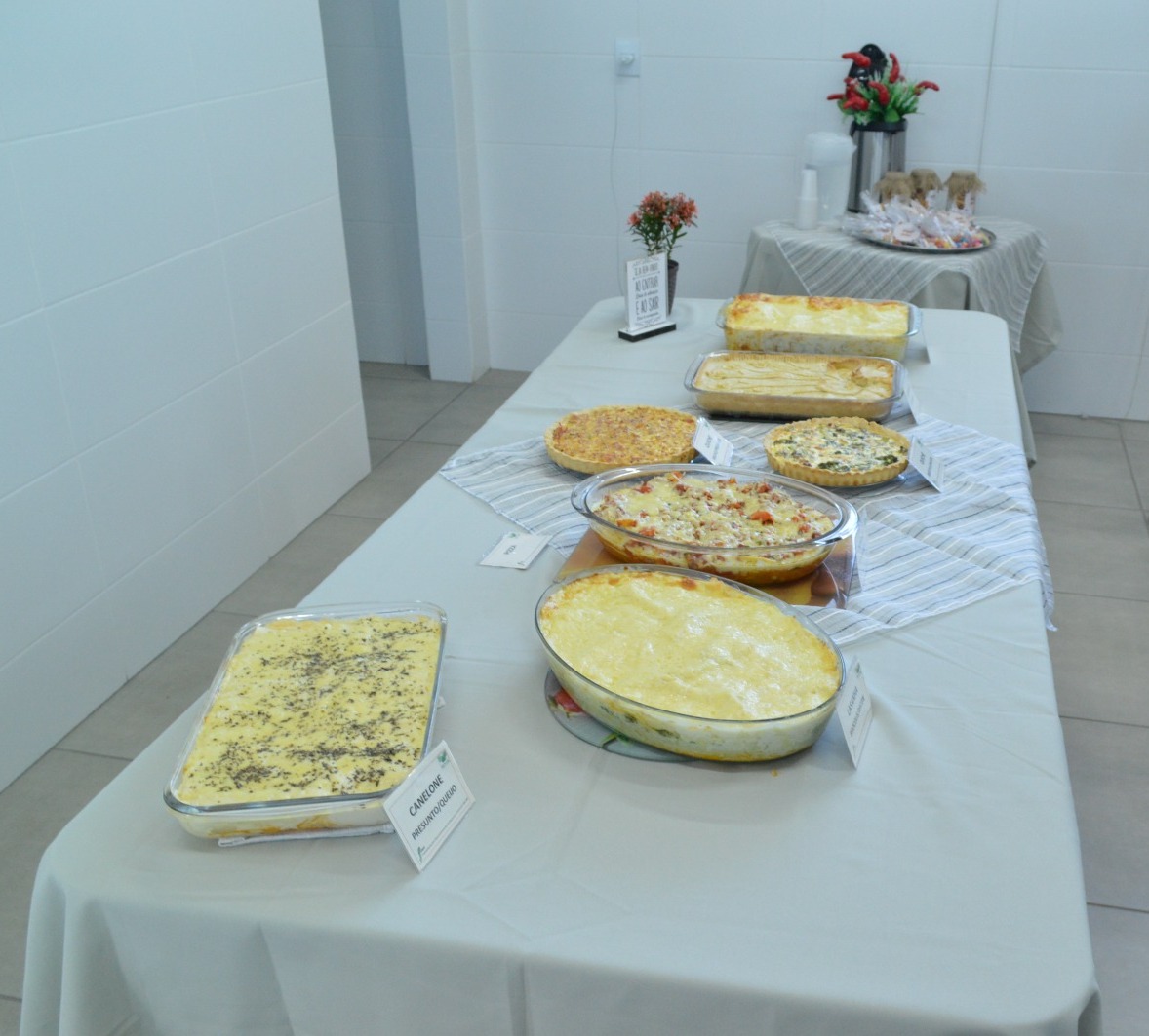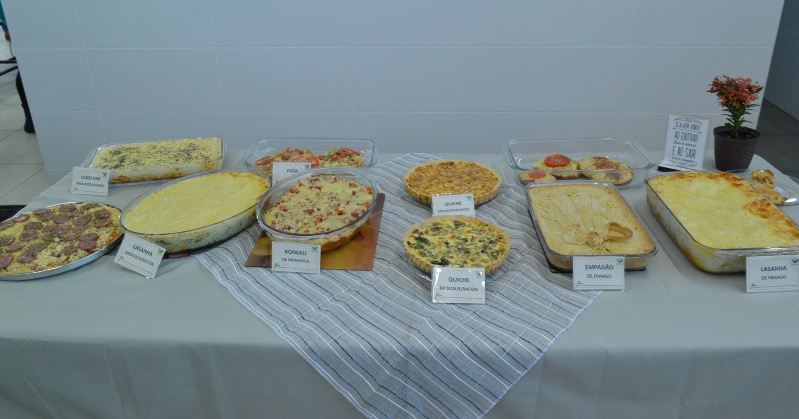 Um “show” de criatividade na confecção, incluindo as decorações. Pizza de linguiça calabresa, mini pizza Marguerita, mini pizza de calabresa, lasanha de frango, lasanha de brócolis e bacon, cannelloni de presunto e queijo, rondelli de moranga, quiche de milho e presunto, quiche de brócolis e bacon e empadão de frango. Já neste vespertino, as mulheres estão fabricando massa de pastel, uma paixão brasileira indiscutível. Recheios salgados e doces, como frango e banana.