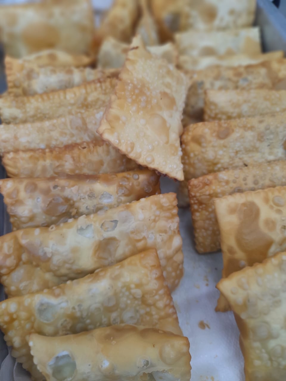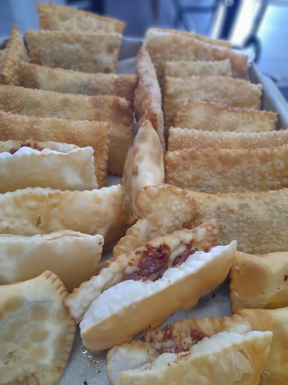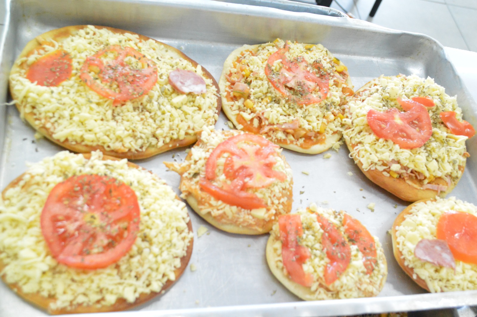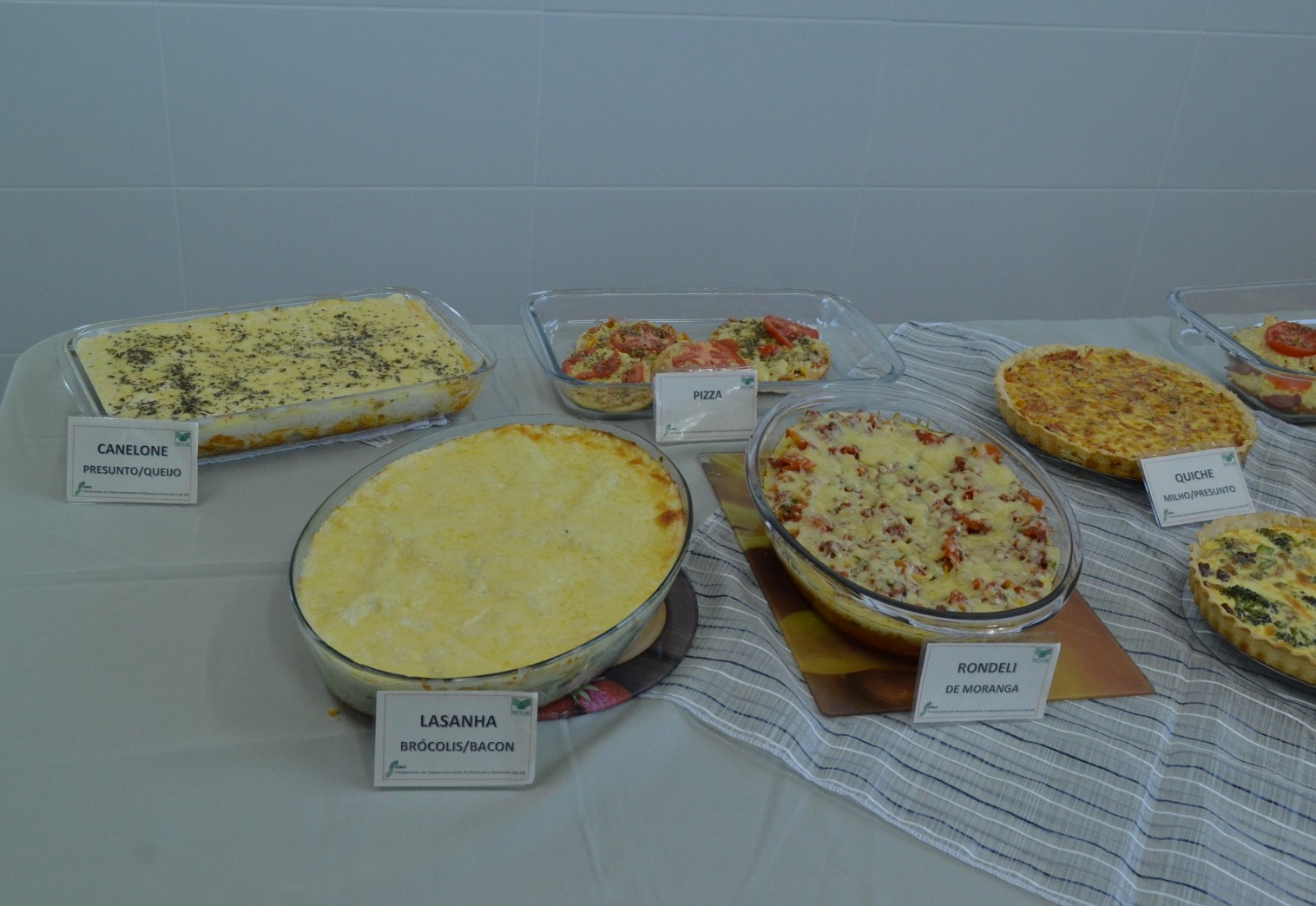 Um “show” de criatividade na confecção, incluindo as decorações. Pizza de linguiça calabresa, mini pizza Marguerita, mini pizza de calabresa, lasanha de frango, lasanha de brócolis e bacon, cannelloni de presunto e queijo, rondelli de moranga, quiche de milho e presunto, quiche de brócolis e bacon e empadão de frango. Já neste vespertino, as mulheres estão fabricando massa de pastel, uma paixão brasileira indiscutível. Recheios salgados e doces, como frango e banana.
