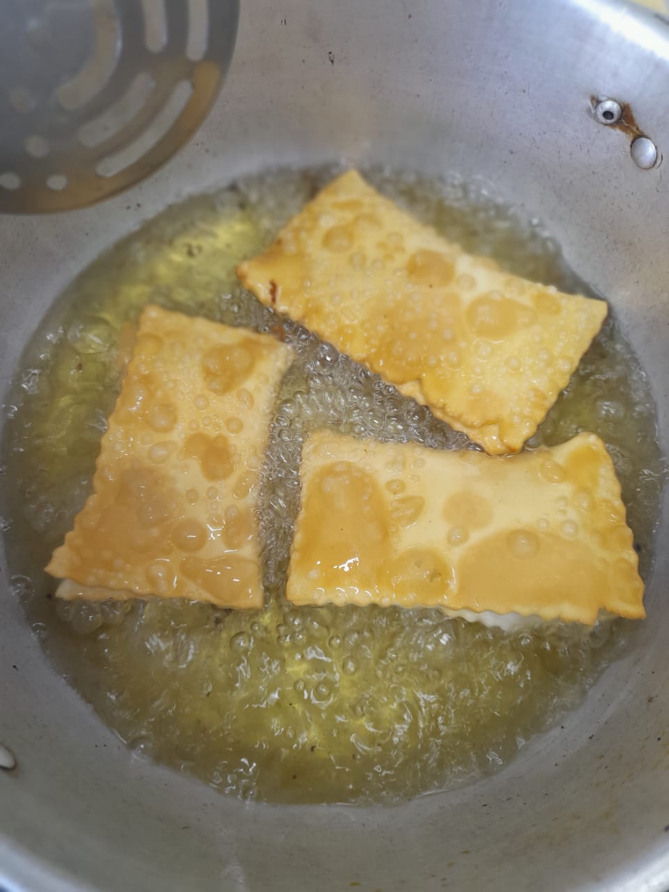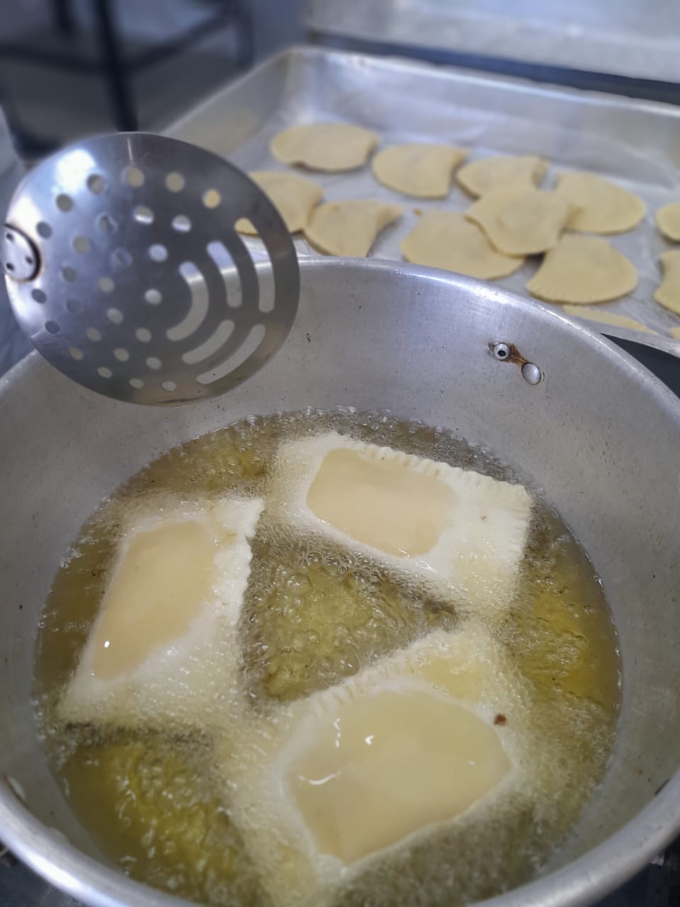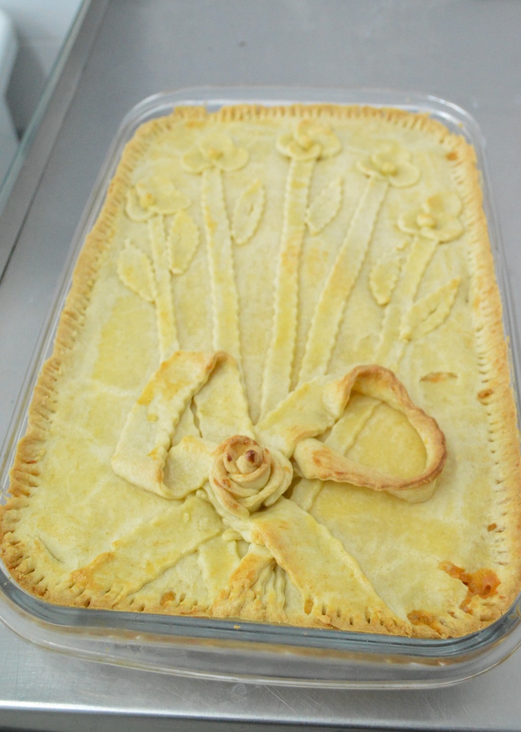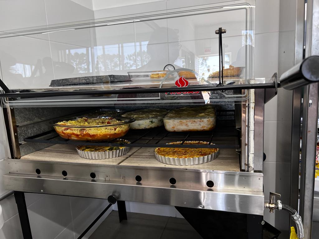 Um “show” de criatividade na confecção, incluindo as decorações. Pizza de linguiça calabresa, mini pizza Marguerita, mini pizza de calabresa, lasanha de frango, lasanha de brócolis e bacon, cannelloni de presunto e queijo, rondelli de moranga, quiche de milho e presunto, quiche de brócolis e bacon e empadão de frango. Já neste vespertino, as mulheres estão fabricando massa de pastel, uma paixão brasileira indiscutível. Recheios salgados e doces, como frango e banana.