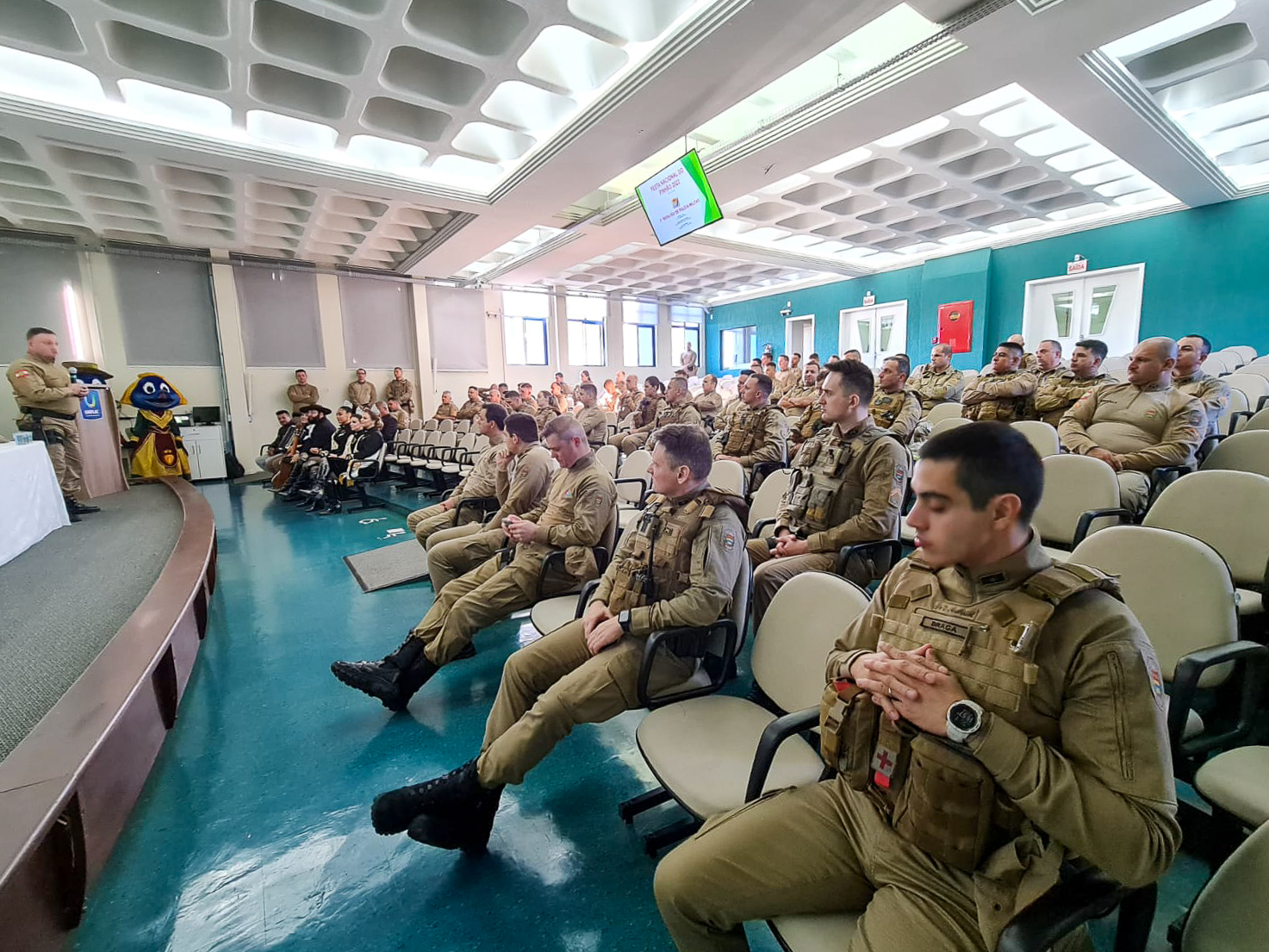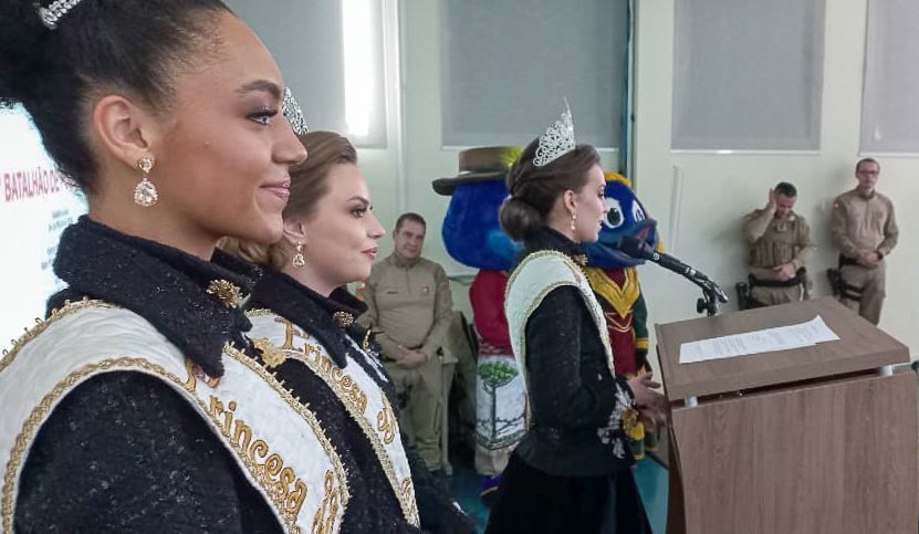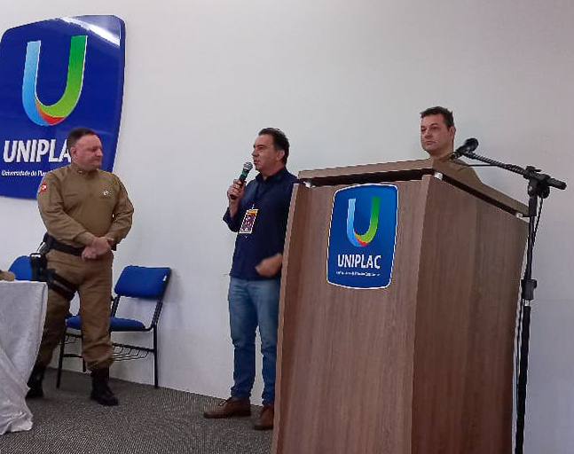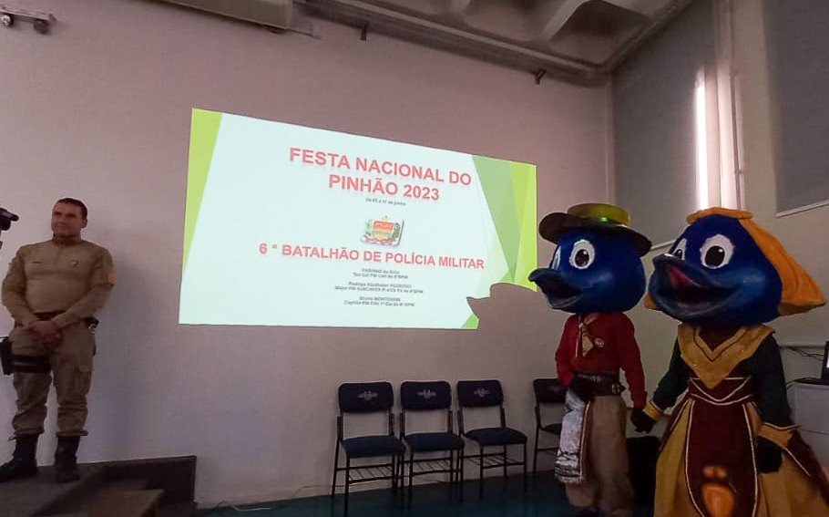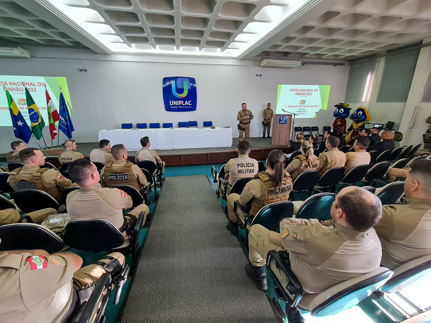 Cerca de 80 policiais militares do Estado de Santa Catarina foram recebidos na tarde desta sexta-feira (2) na Uniplac (Universidade do Planalto Catarinense) pelo Superintendente da Fundação Cultural de Lages, Giba Ronconi, Rainha e Princesas da 33ª Festa Nacional do Pinhão, Mariane Vialli, Ana Maira de Oliveira e Magê Brusius, os músicos Paulinho Guazzelli e Victor Colombo e o casal de gralhas.
