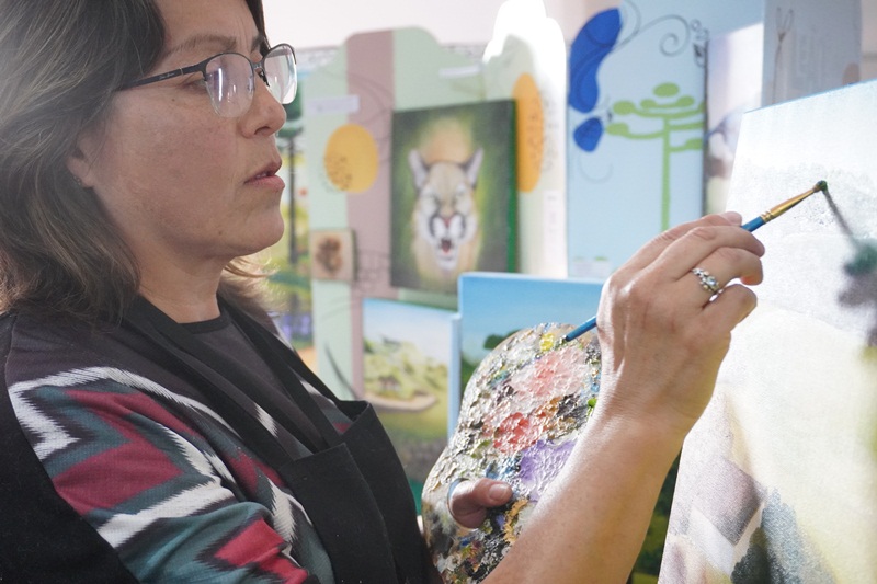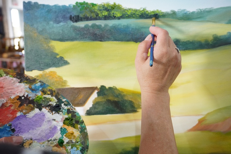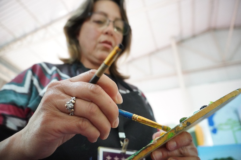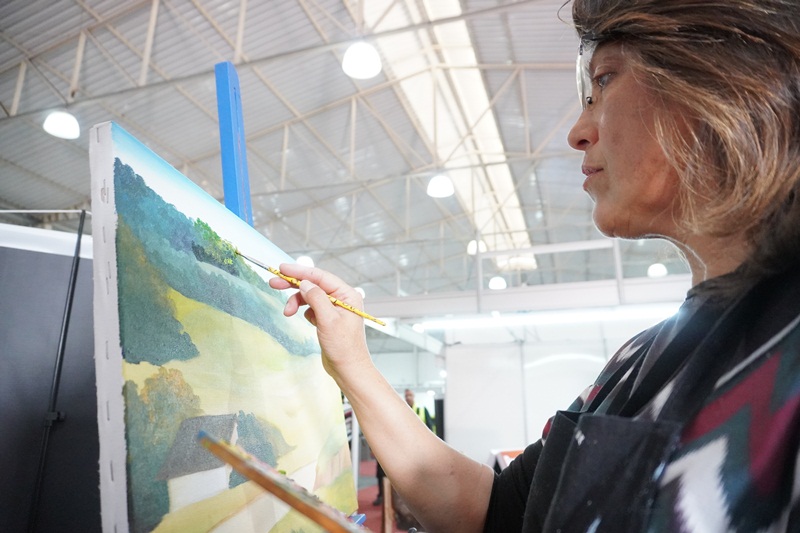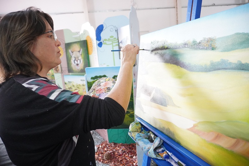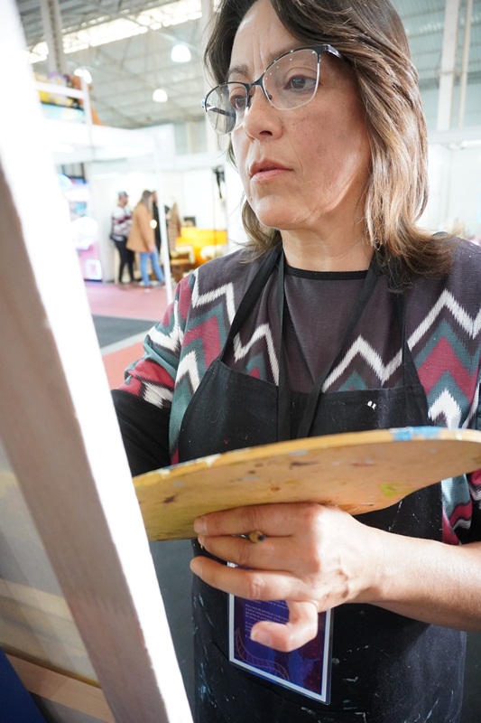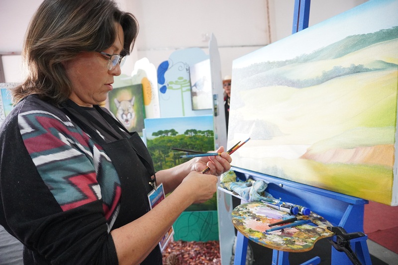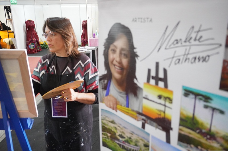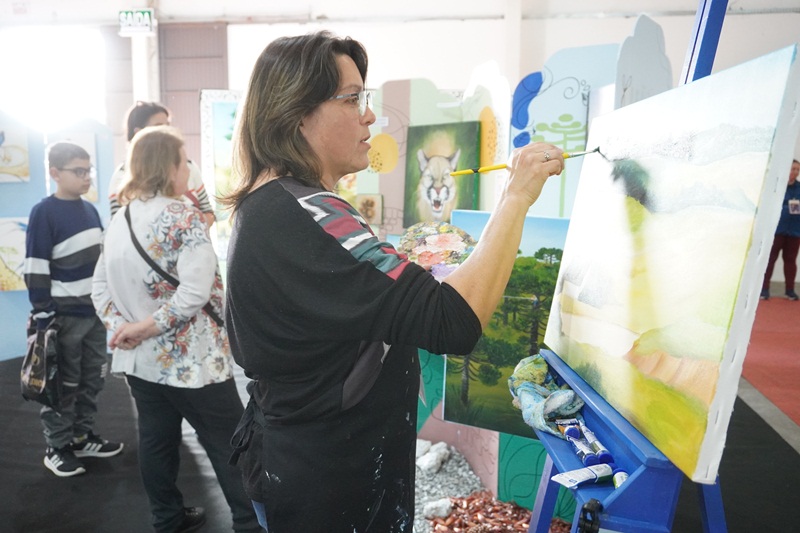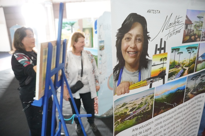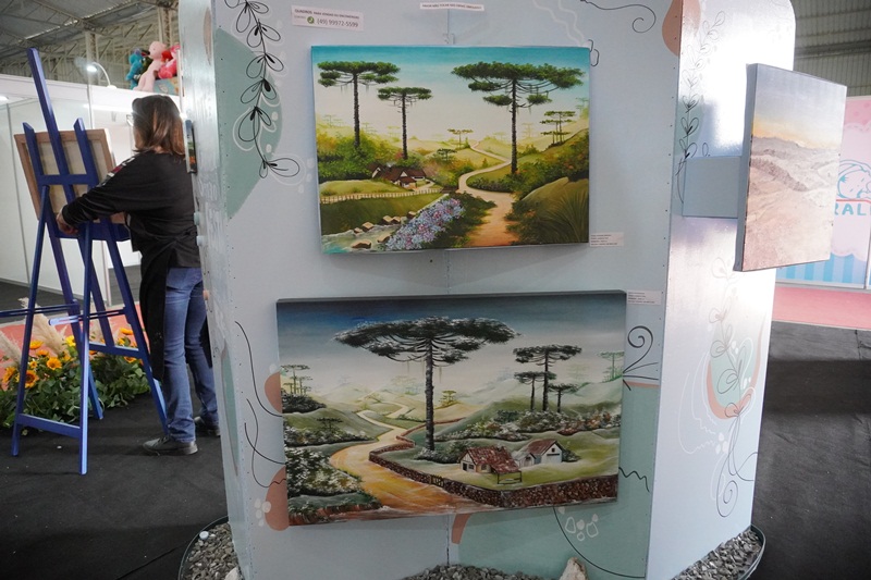 A pintura em tempo real, da paisagem serrana, obra intitulada “Geada”, de autoria da artista plástica, Marlete Palhano, ainda está em andamento, o qual os visitantes poderão acompanhar durante esta semana de Festa. “Pintar ao vivo, demonstrar o processo artístico do artista na questão de técnicas da linguagem visual da pintura: Mistura de cores, sombreamento, luminosidade, texturas visuais. E também estar em contato diretamente com o apreciador de arte, o público. São sensações lindas”, avalia a artista plástica, Marlete Palhano, ao acrescentar: “Ser artista é adquirir conhecimento pela pesquisa de materiais e suportes diversos, contextualizando a história da arte com a prática. É deste jeito que crio as minhas obras de forma expressiva e educativa.”