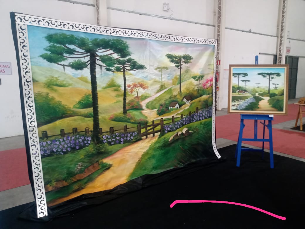 Os lageanos e turistas presentes no Parque de Exposições Conta Dinheiro na tarde ensolarada de domingo (4 de junho), na 33ª Festa Nacional do Pinhão, surpreendidos por um lazer inusitado: Acompanhar a produção de uma tela ao vivo, pois não é todo dia que esbarramos tão de perto em um artista concentrado nos aspectos de imaginação, elaboração de cena e criação em exercício, ao instigar e aguçar sua intelectualidade, perspicácia e técnica ali, na frente de pessoas curiosas.