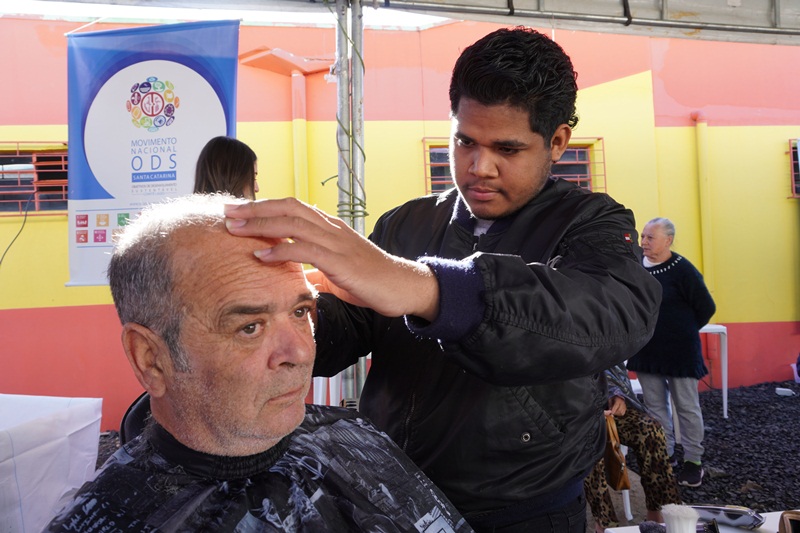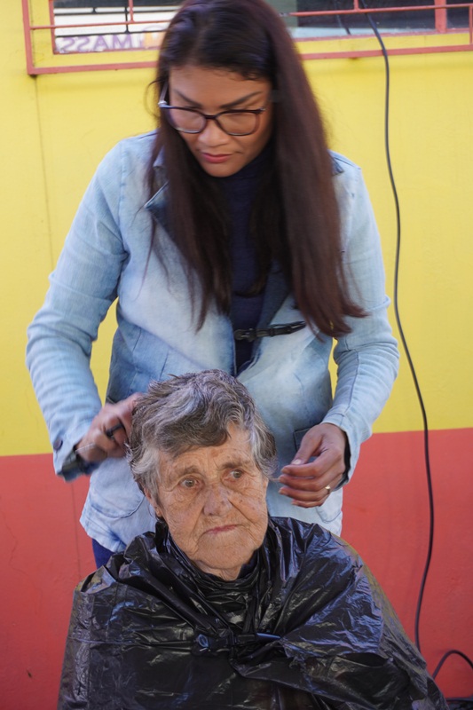 A senhora Odete Souza de Liz, 78 anos, aproveitou a oportunidade bem próxima à sua casa e fez um corte de cabelo. “Tenho muita dificuldade para ir ao Centro, sempre tenho que pedir a alguém para me levar, então ter esse serviço assim pertinho é uma comodidade”, comentou. O corte de cabelo feminino e escova foram ofertados, de forma gratuita, pela profissional Betzaida Del Valle Zerpa, proprietária da Esmaltaria Nacional Lages. Ao público masculino foram ofertados serviços de barbeiro, em parceria com o profissional Oscar José Zerpa. Ainda na área da beleza, a diretora da Mary Kay, Naiara Antunes disponibilizou o serviço de consultoria de imagem pessoal voltada para entrevista de emprego e automaquiagem básica.