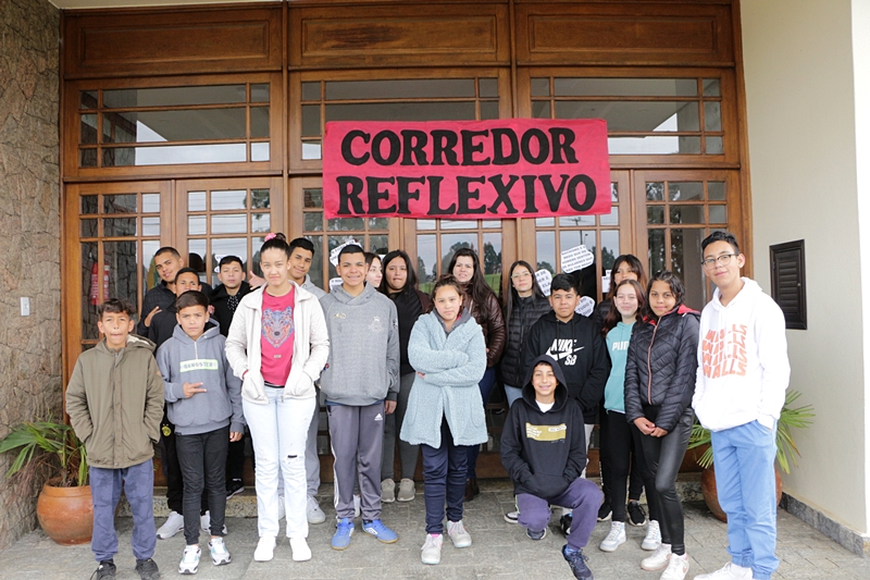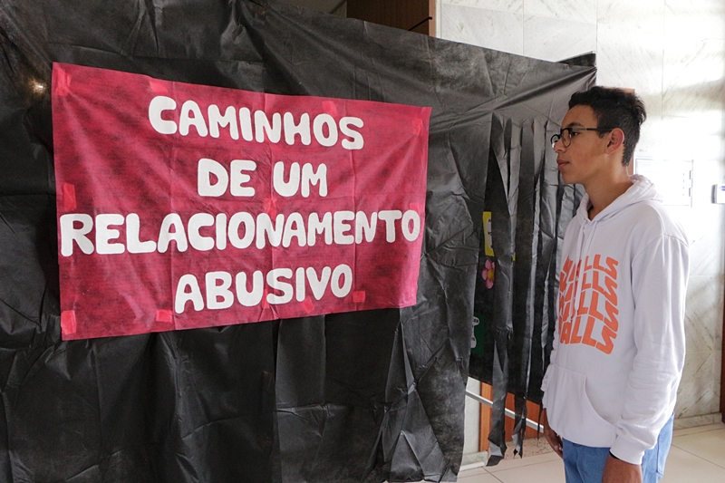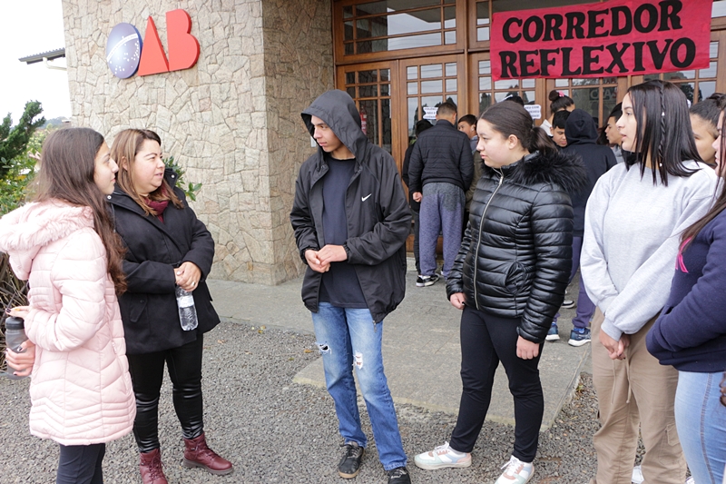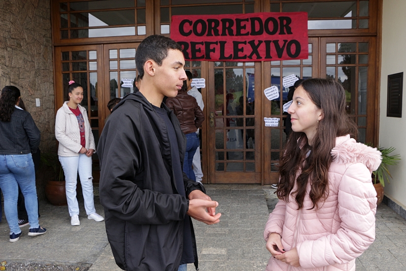 Os colegas de sala de aula do 8ª ano da Escola Municipal de Educação Básica (Emeb) Professor Osni de Medeiros Régis, Gabriella Tillmann, 13 anos, moradora do bairro Guarujá, e Rafael Nunes, 14, do bairro Tributo, aproveitaram os ensinamentos do Corredor Reflexivo - “Relacionamentos abusivos” da manhã de segunda-feira (29 de agosto) e ficaram animados pela novidade de ser uma abordagem fora das paredes da escola, tirando-os da rotina. “A ação faz a gente pensar nas coisas que acontecem hoje em dia e que não são de agora. Há séculos a mulher é tratada diferente. Com as palestras e as leis, a gente fica sabendo como agir com o que nos deparamos. Temos de mudar, e para melhor”, acentua a garota.