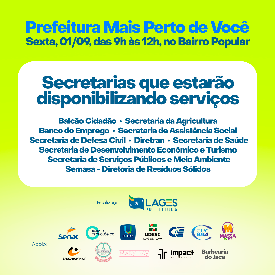 A Prefeitura de Lages promoverá nesta sexta-feira (1°) o programa “Prefeitura Mais Perto de Você”. A ação ocorrerá das 9h às 12h na rua Sebastião Ataíde, s/n°, no bairro Popular, em frente à Unidade Básica de Saúde. O local estará preparado para receber a ação, portanto a via estará fechada para passagem de veículos. O local será sinalizado pelos Agentes de Trânsito da Diretran.