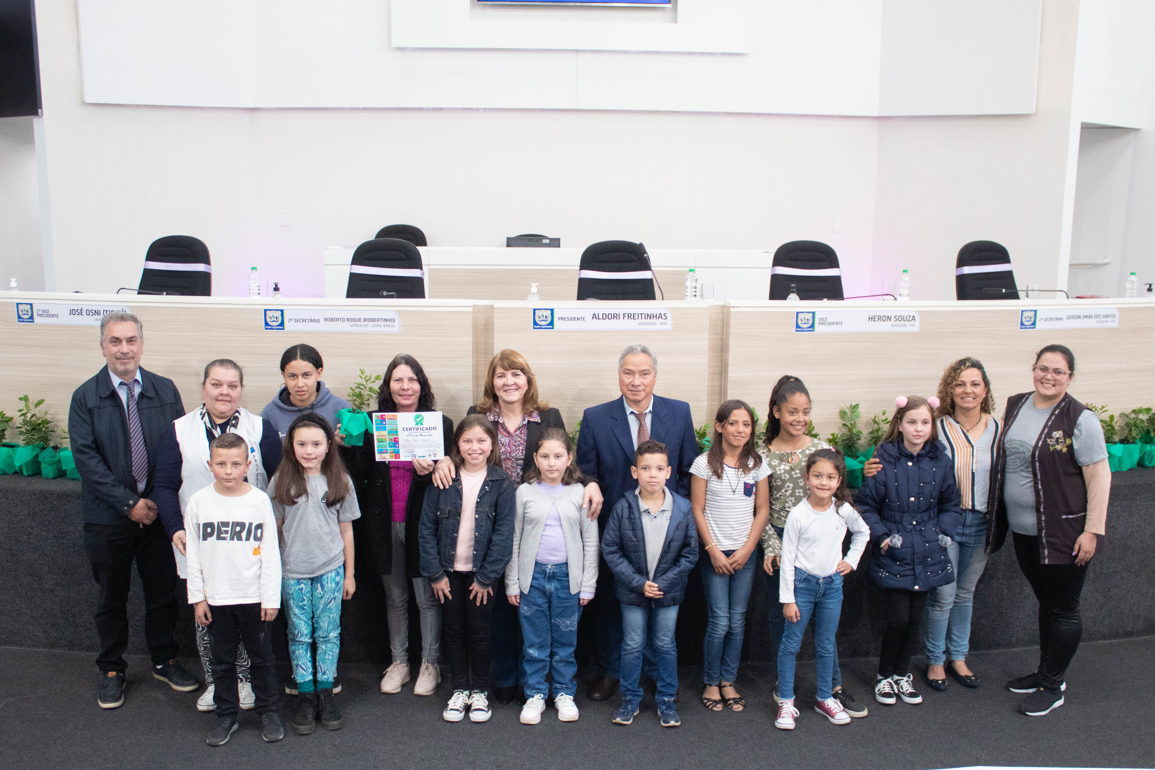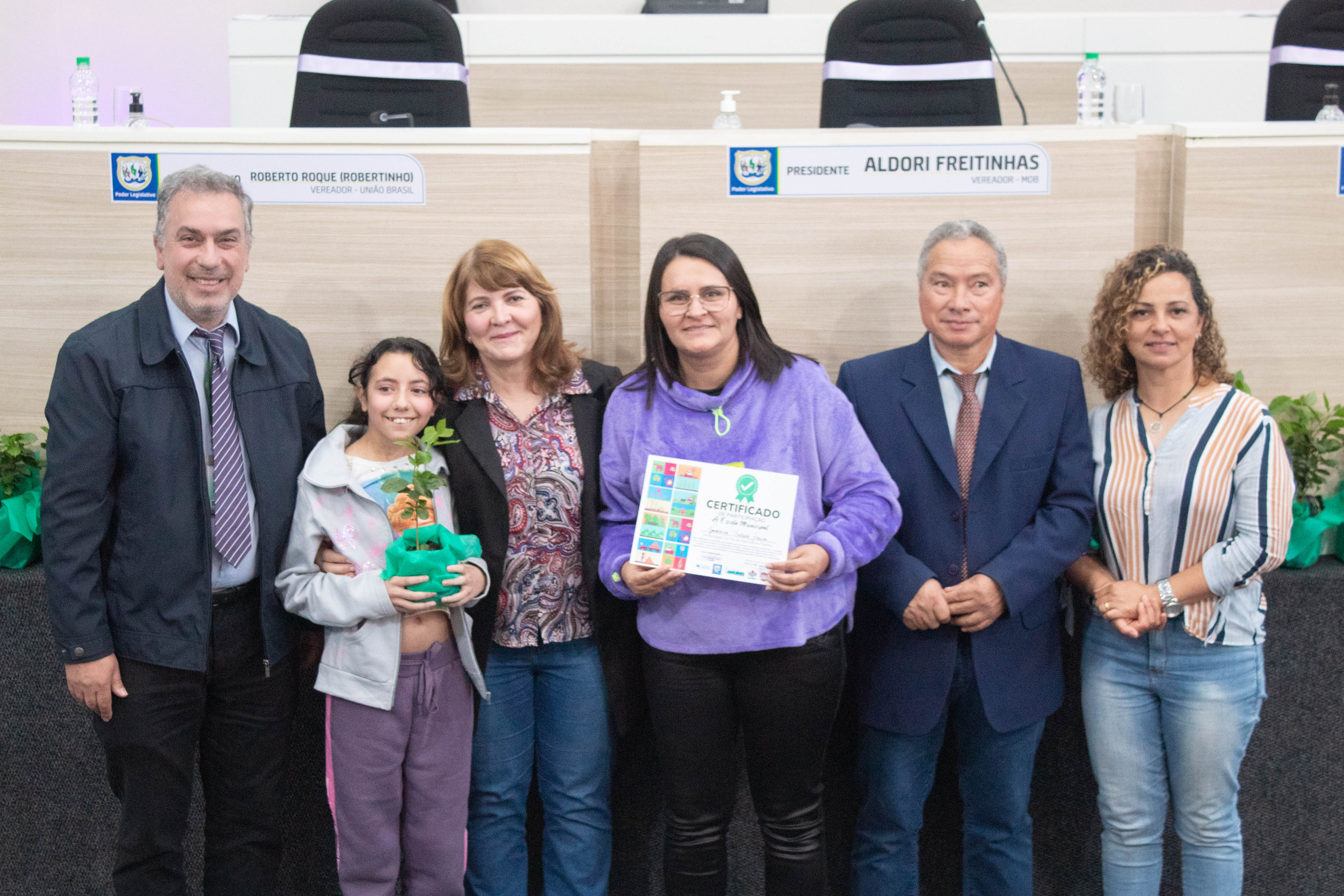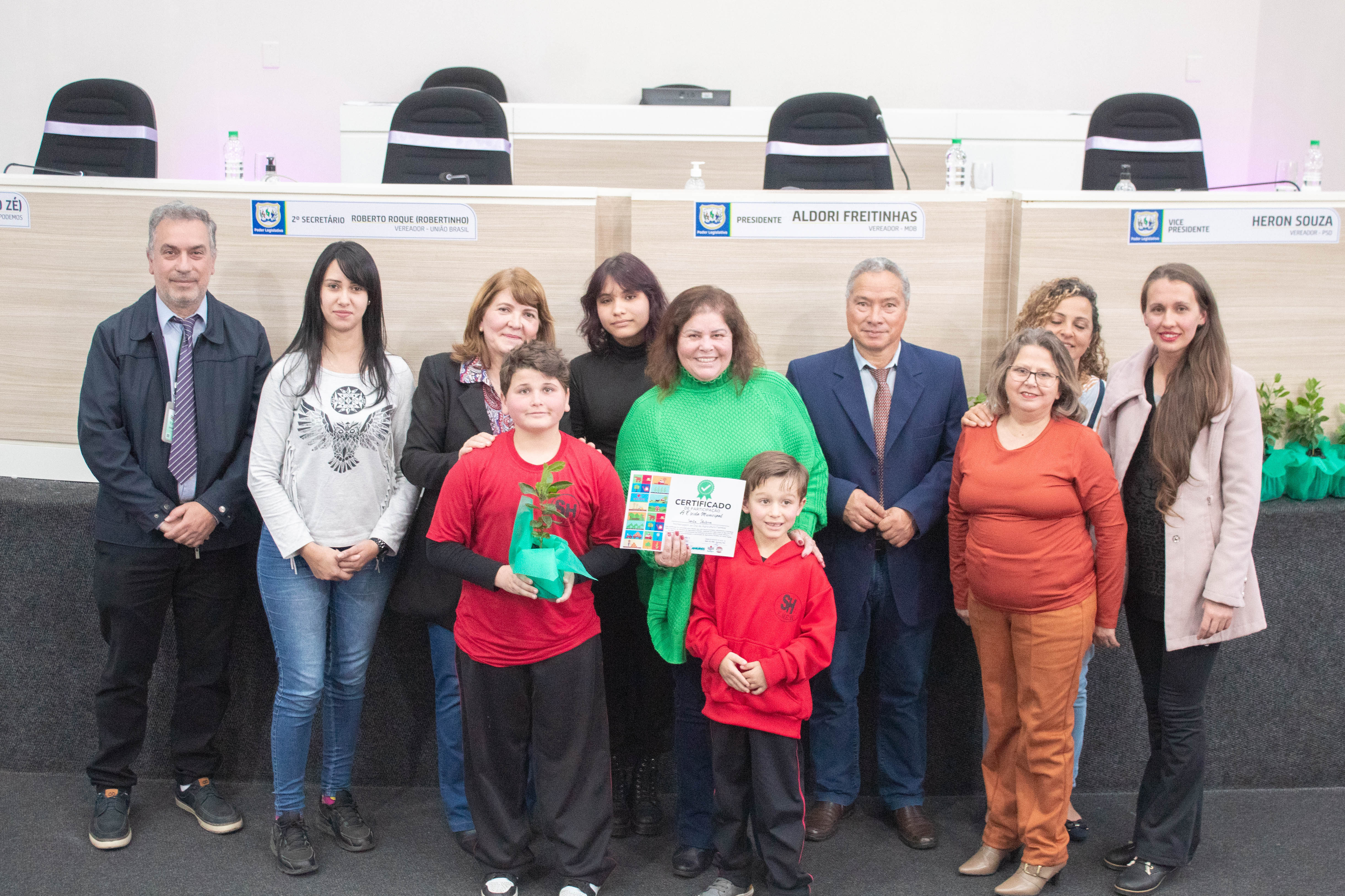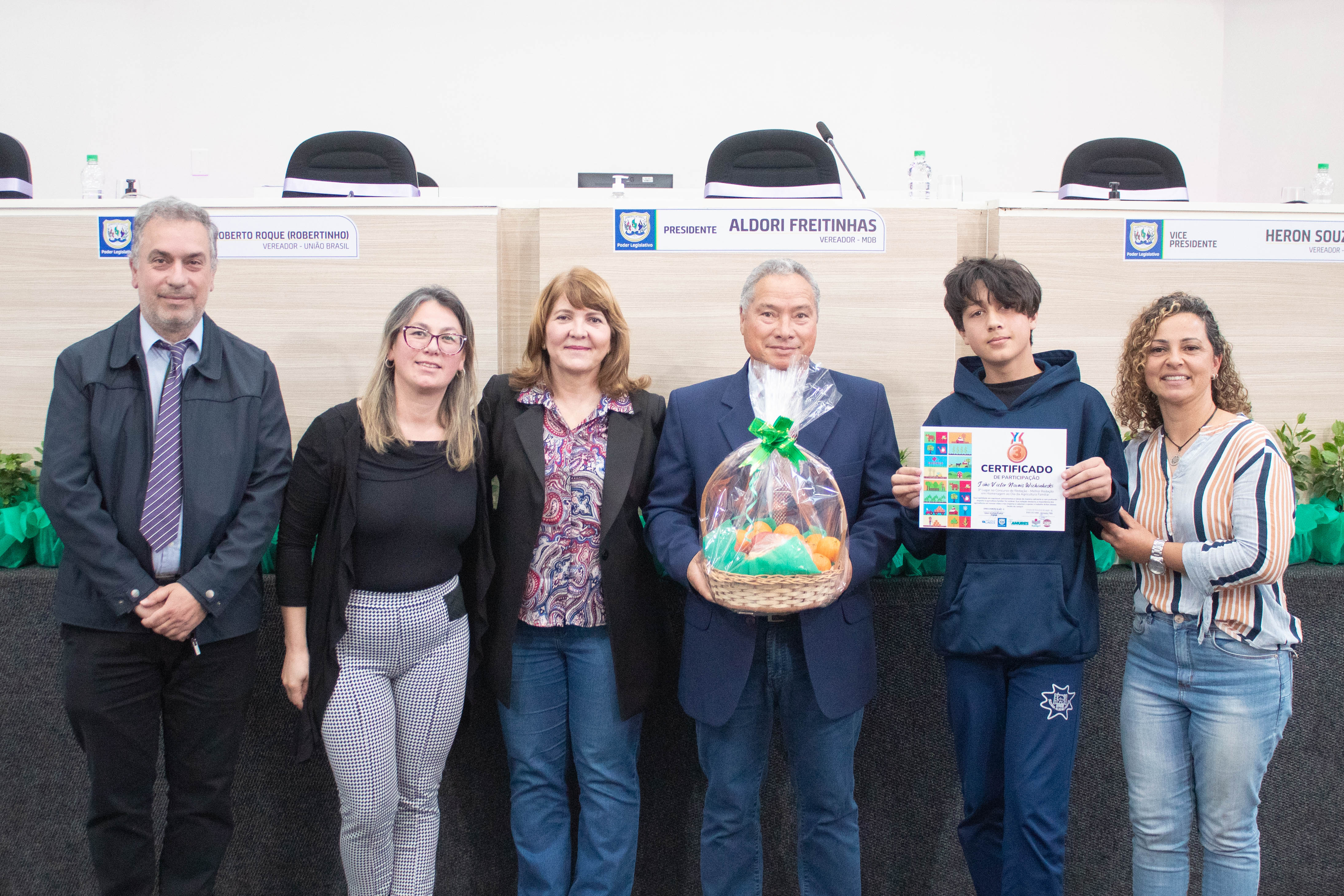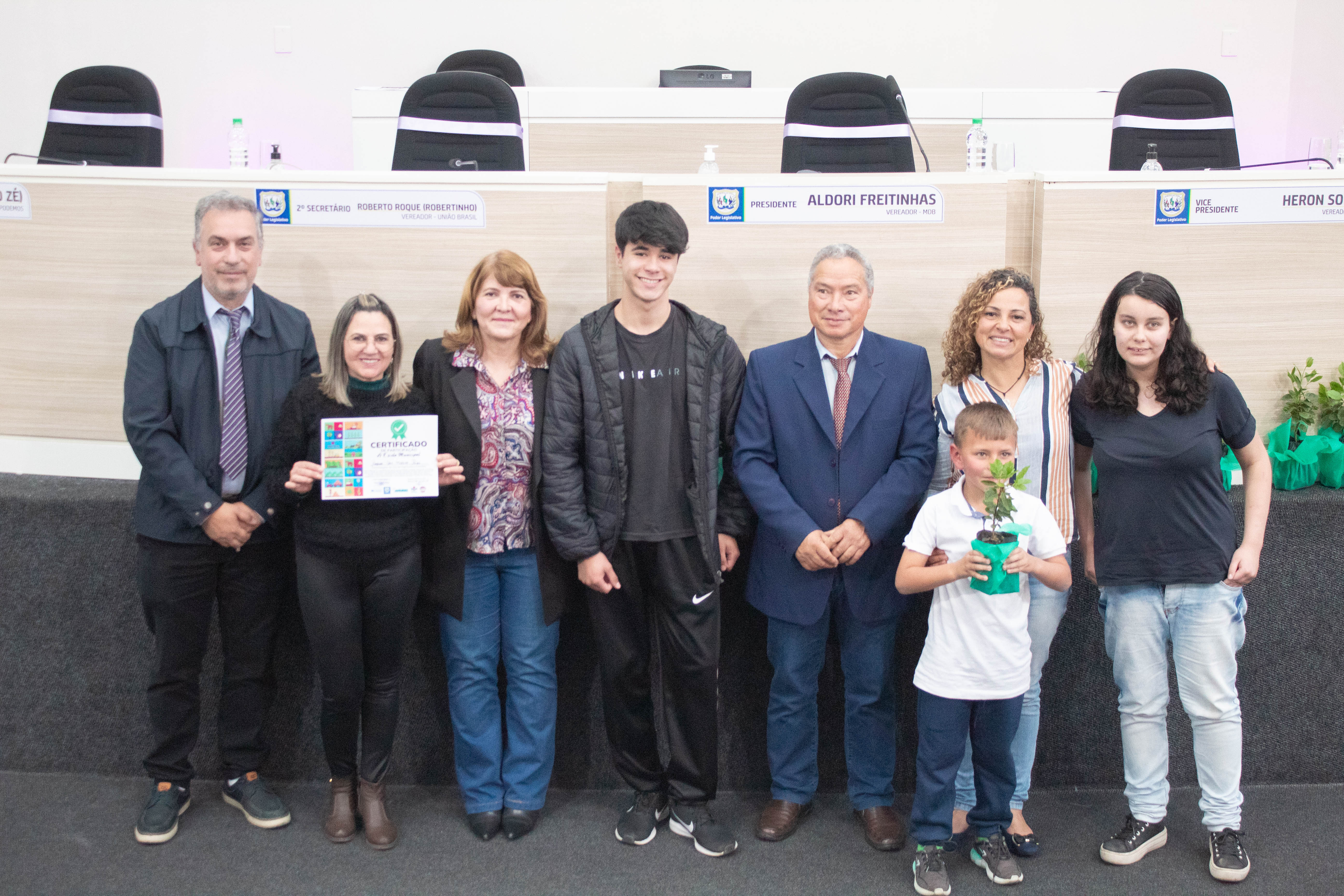 Em cerimônia que aconteceu na tarde de ontem da última quarta-feira (30), estudantes do Sistema Público Municipal de Educação que participaram de concurso referente à Semana da Agricultura Familiar, celebrada no mês de julho, foram homenageados na Câmara de Vereadores. A solenidade aconteceu no plenário do Legislativo Municipal e reuniu estudantes, diretoras, professores, vereadores e familiares. A homenagem foi uma iniciativa do vereador Enio do Vime, que presidiu o ato.