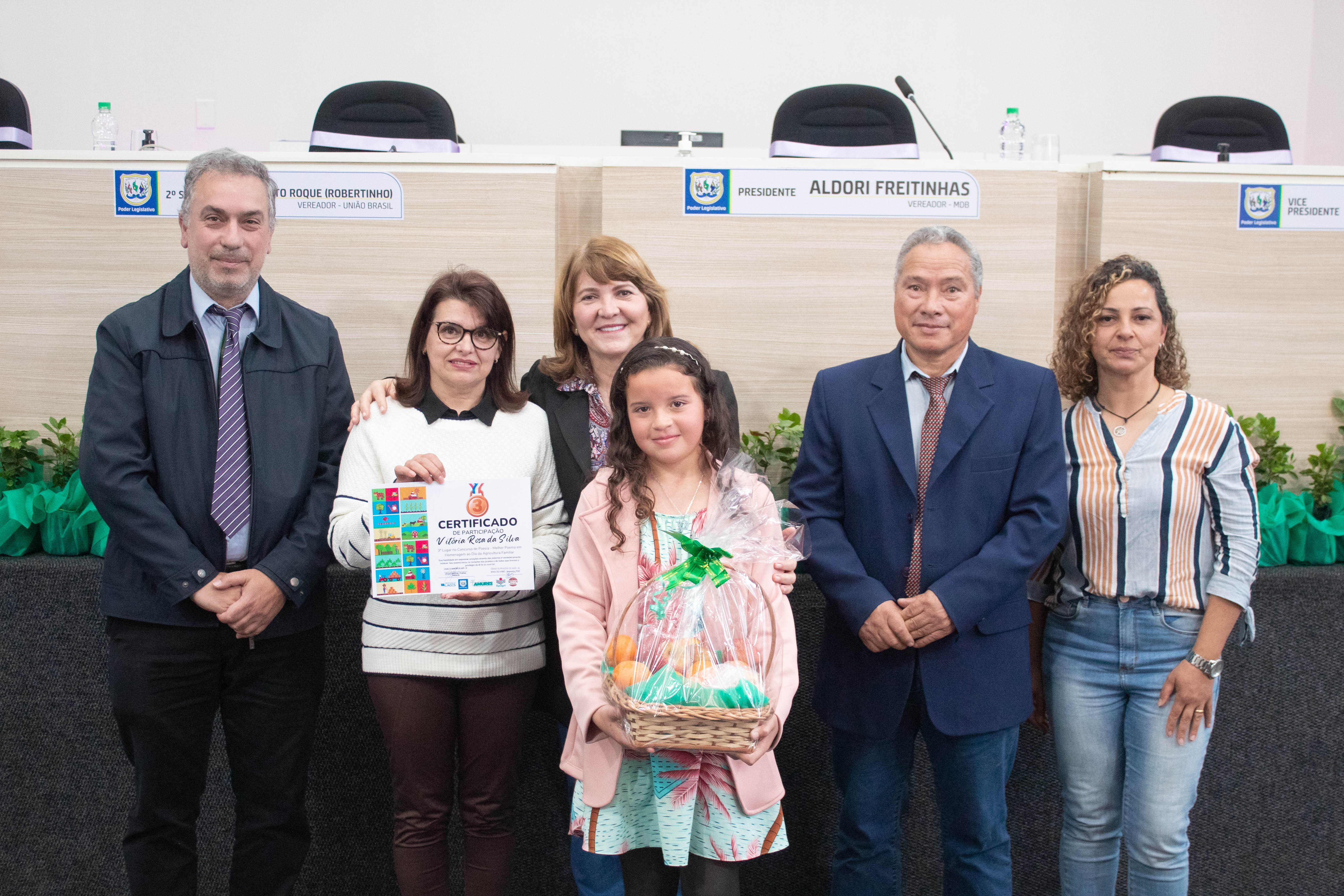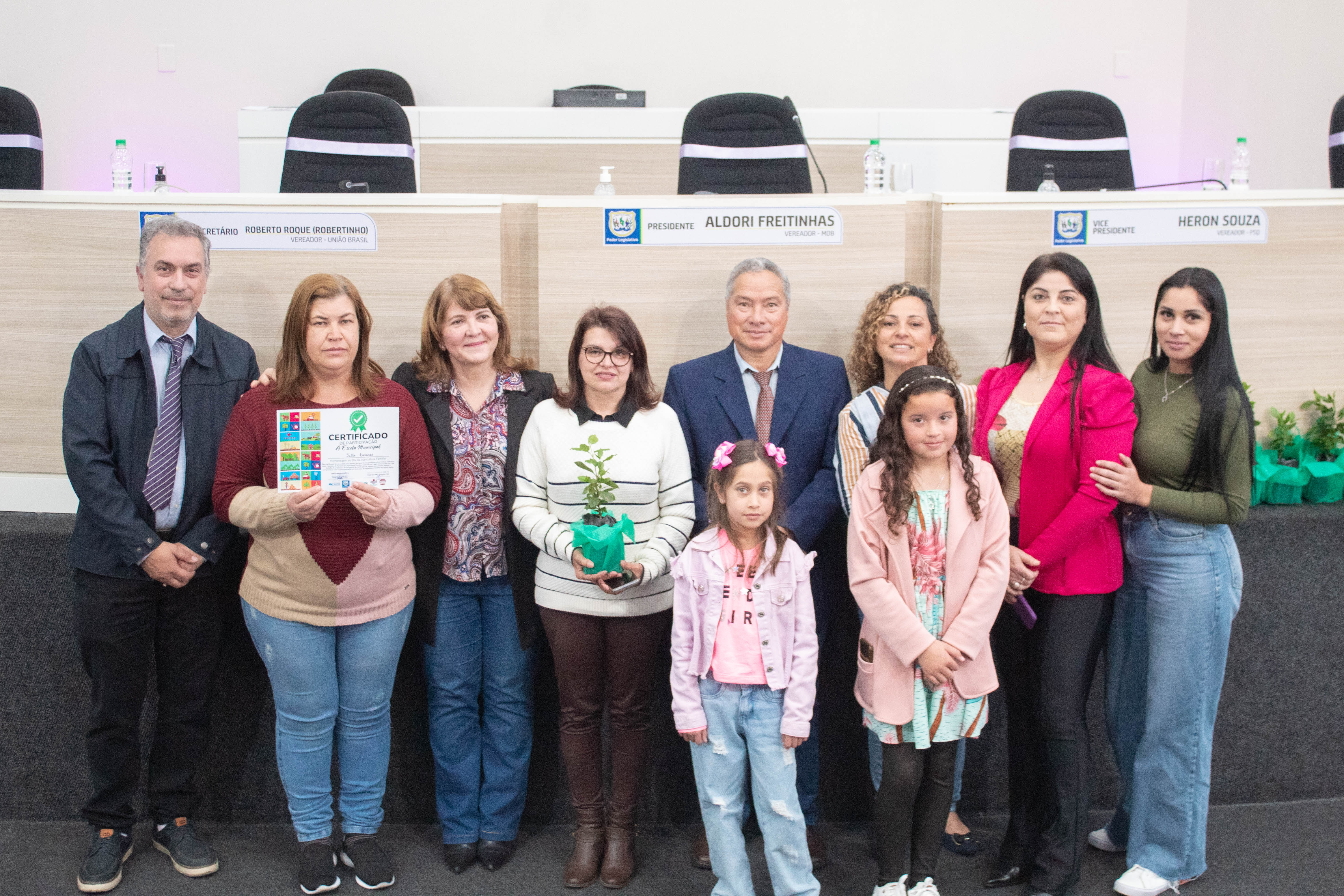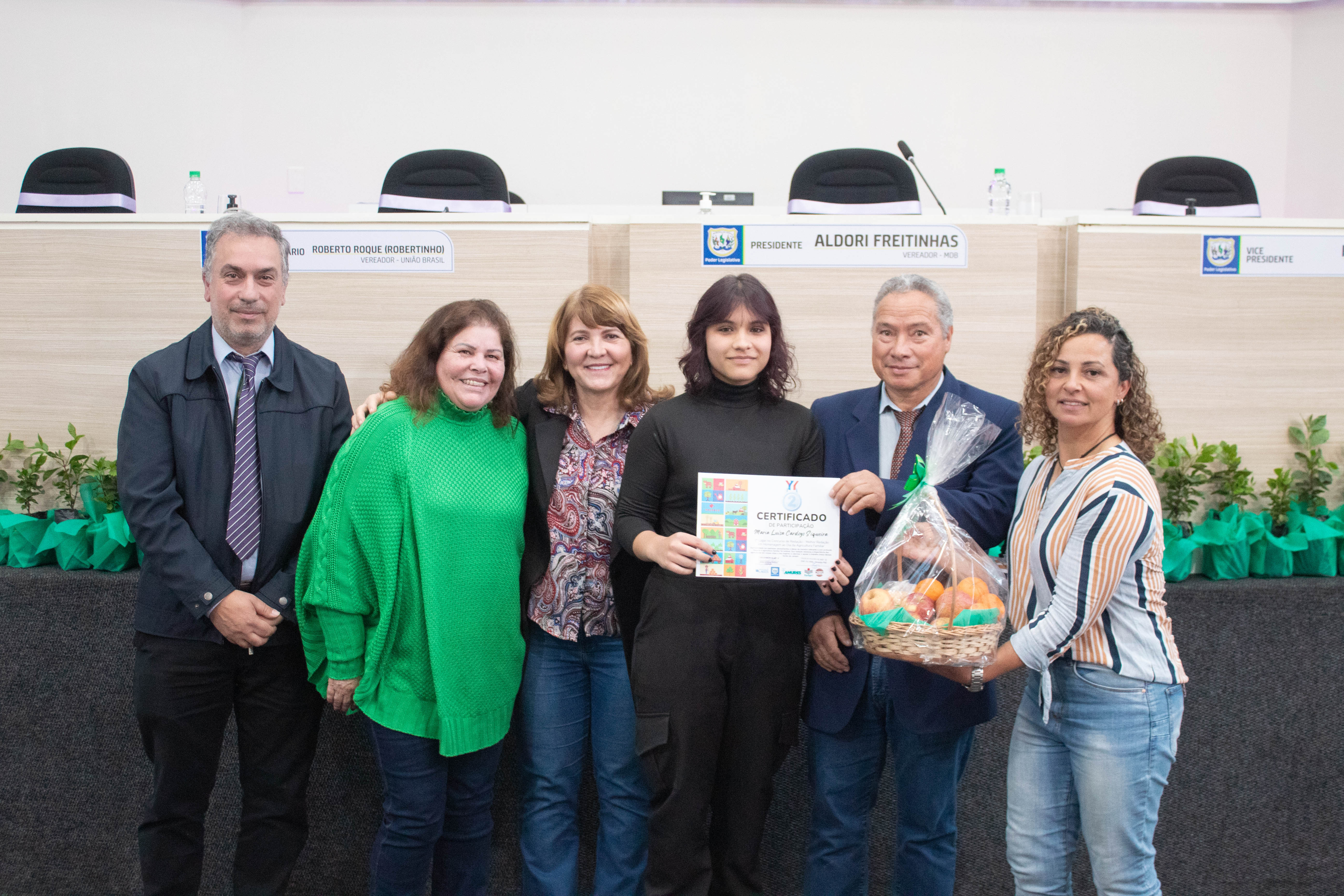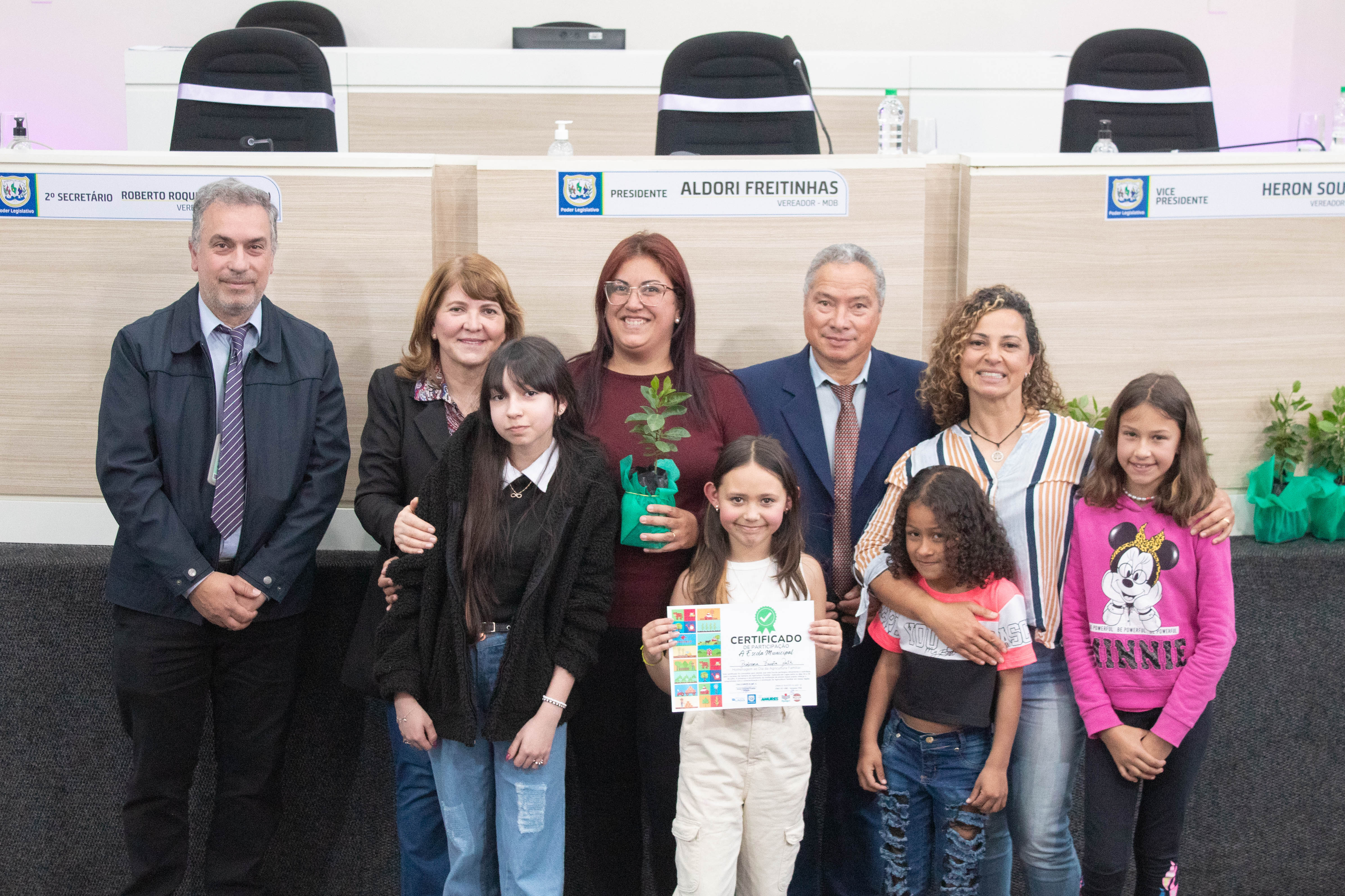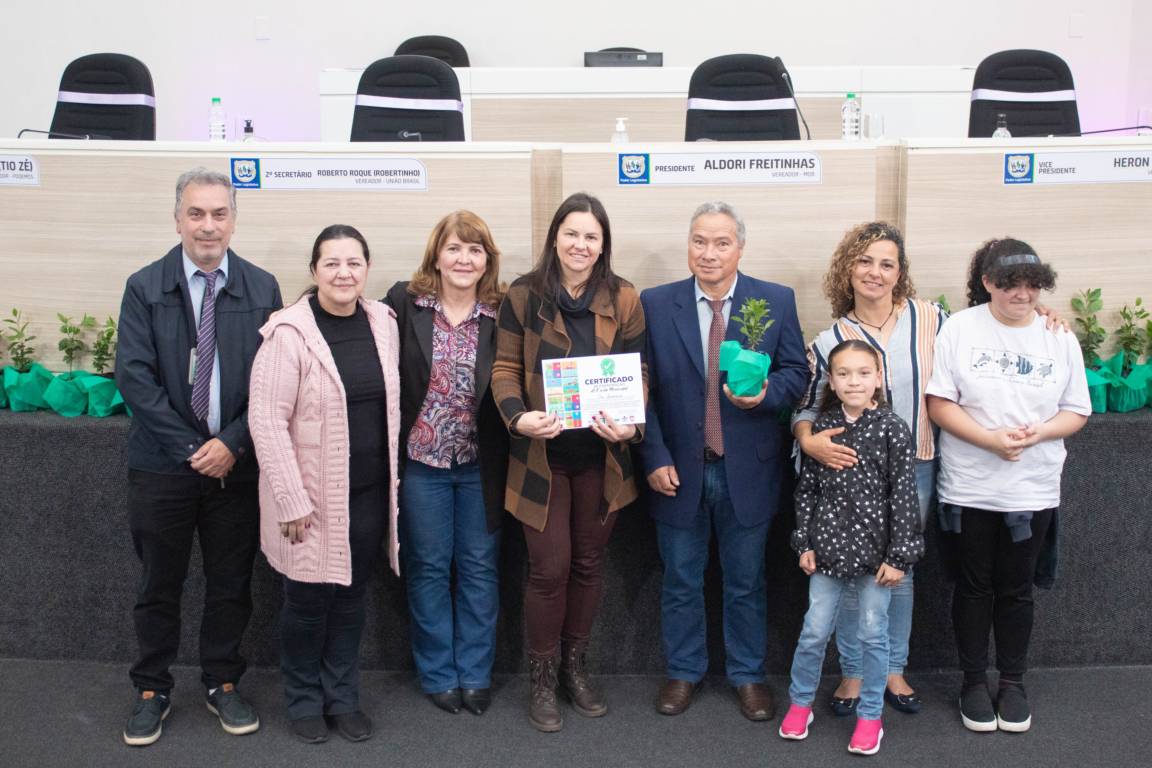 Em cerimônia que aconteceu na tarde de ontem da última quarta-feira (30), estudantes do Sistema Público Municipal de Educação que participaram de concurso referente à Semana da Agricultura Familiar, celebrada no mês de julho, foram homenageados na Câmara de Vereadores. A solenidade aconteceu no plenário do Legislativo Municipal e reuniu estudantes, diretoras, professores, vereadores e familiares. A homenagem foi uma iniciativa do vereador Enio do Vime, que presidiu o ato.