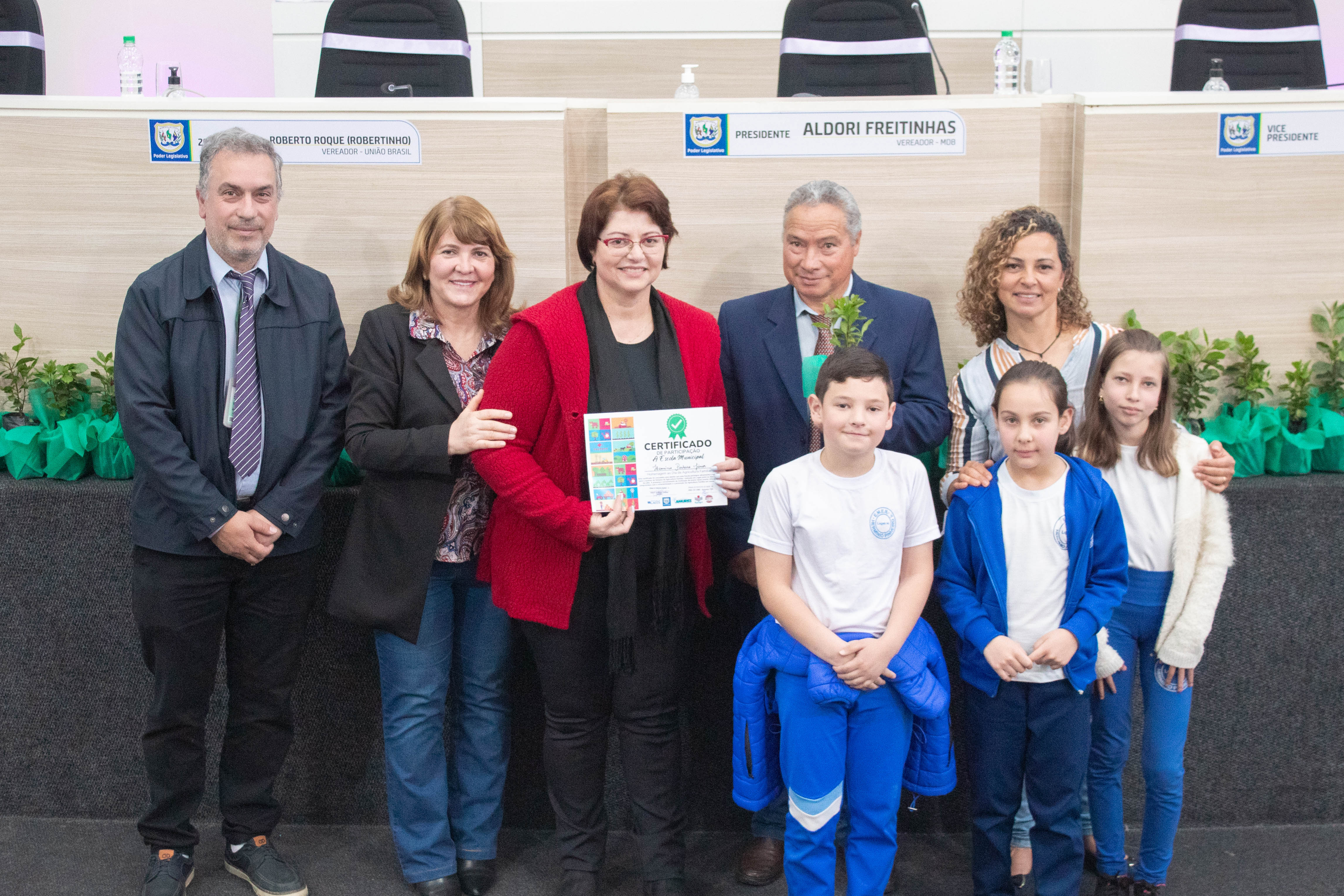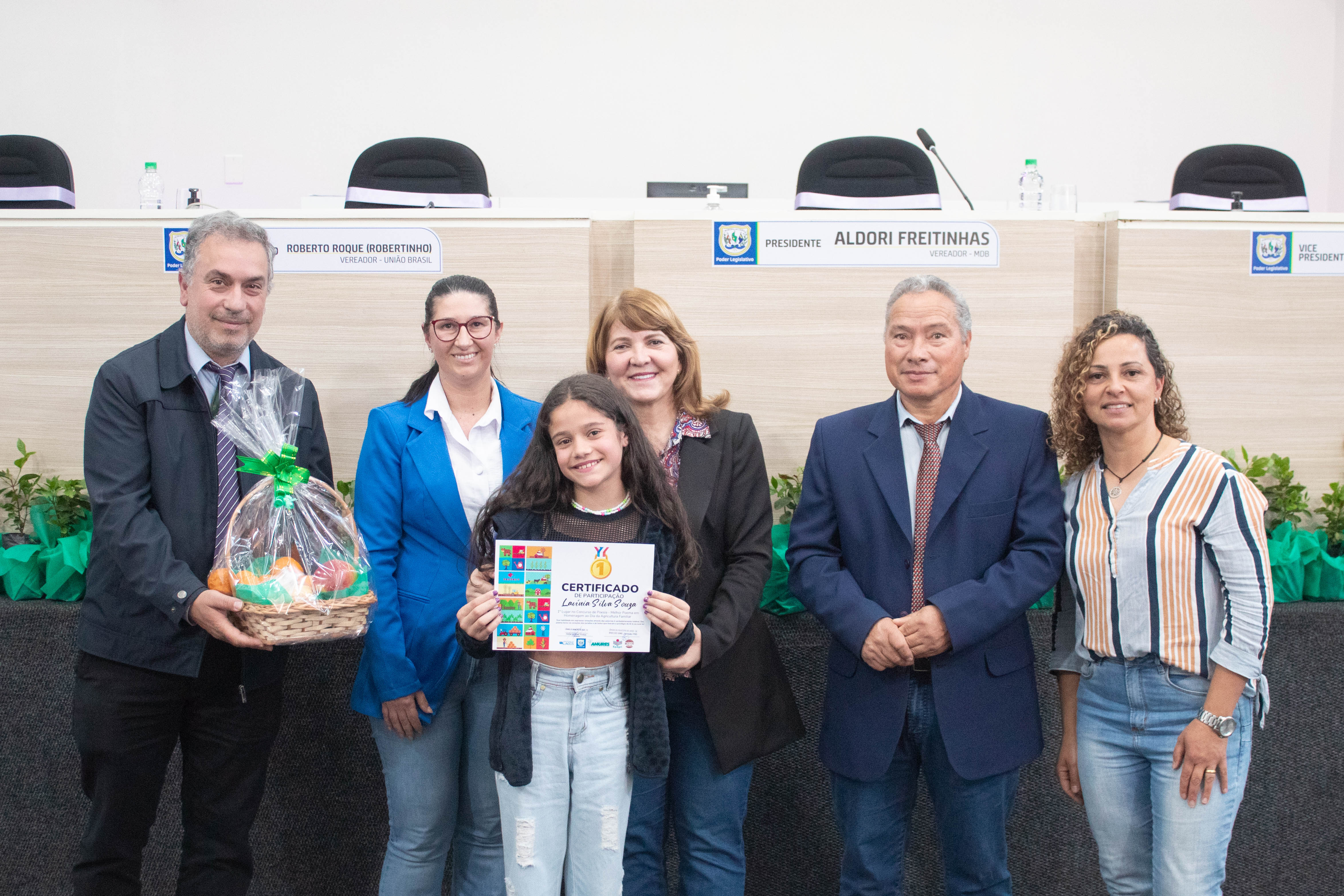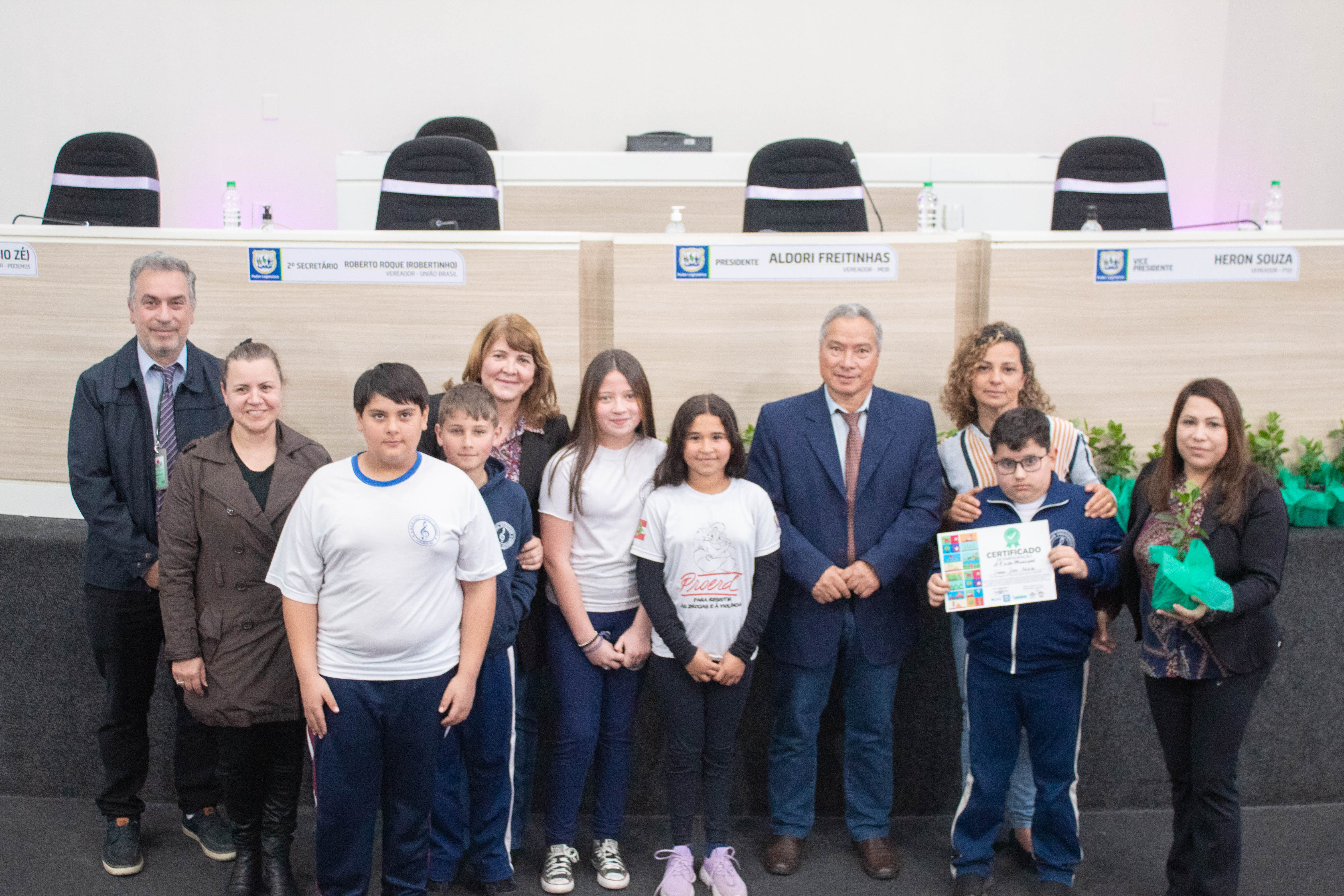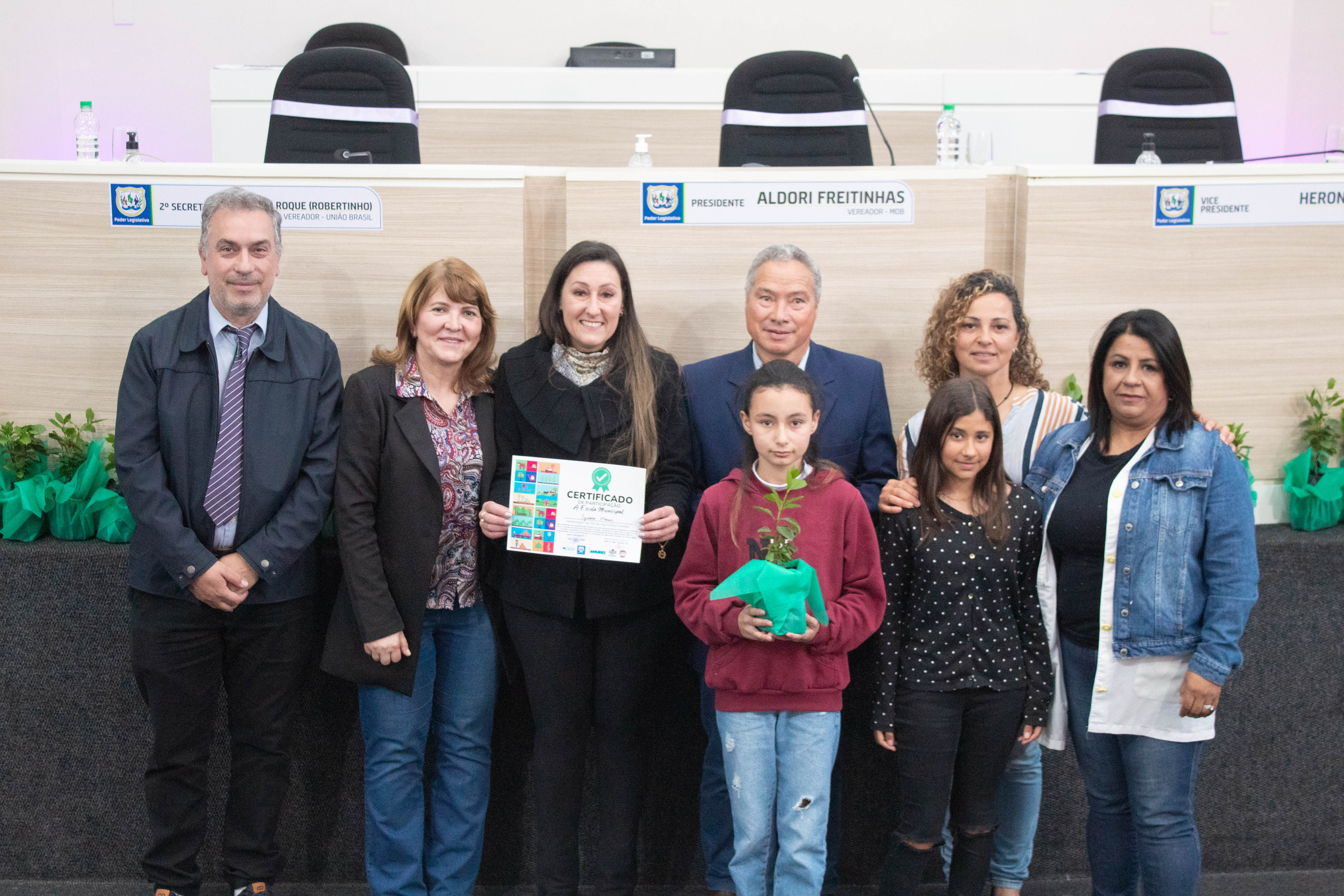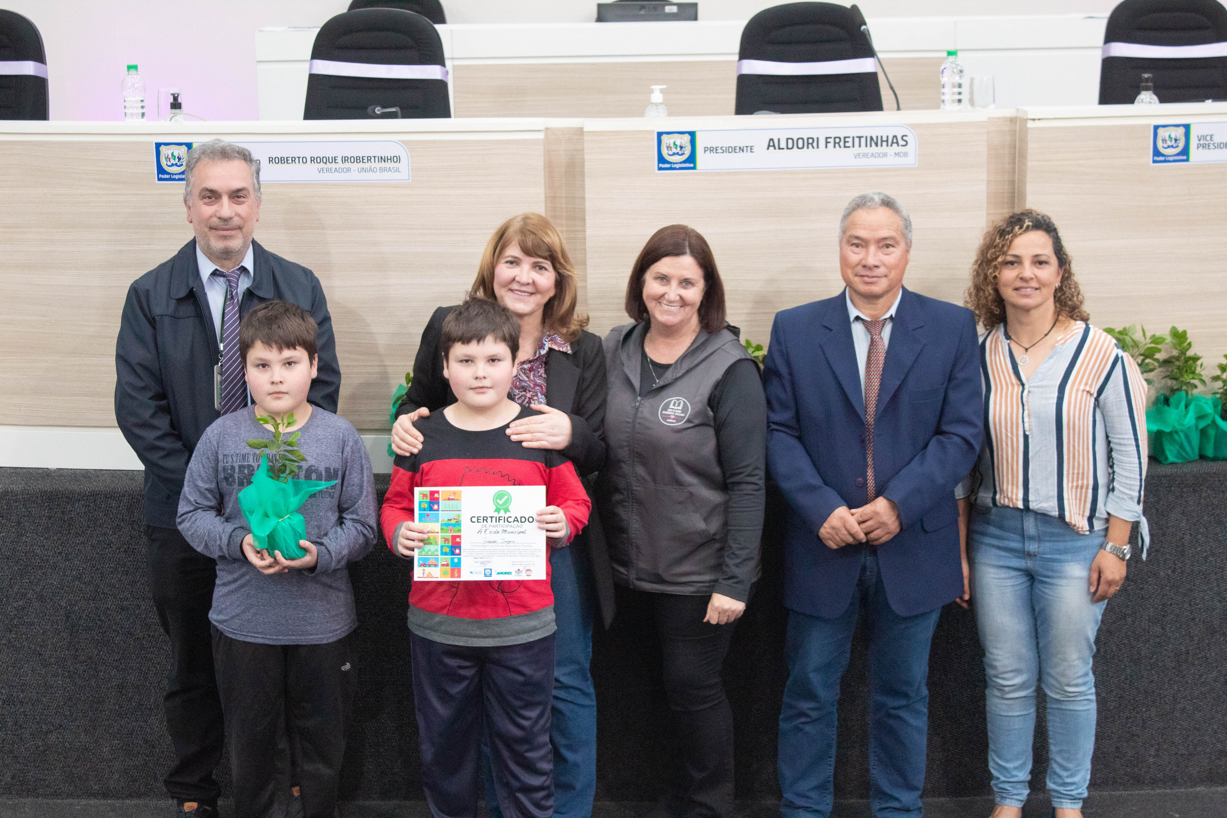 Em cerimônia que aconteceu na tarde de ontem da última quarta-feira (30), estudantes do Sistema Público Municipal de Educação que participaram de concurso referente à Semana da Agricultura Familiar, celebrada no mês de julho, foram homenageados na Câmara de Vereadores. A solenidade aconteceu no plenário do Legislativo Municipal e reuniu estudantes, diretoras, professores, vereadores e familiares. A homenagem foi uma iniciativa do vereador Enio do Vime, que presidiu o ato.