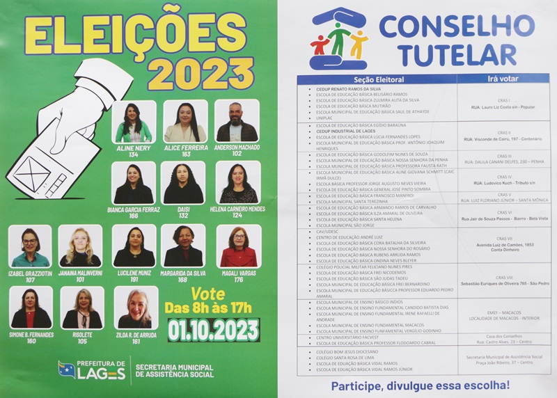 Assim como em todo país, a eleição do Conselho Tutelar dos Direitos das Crianças e Adolescentes de Lages aconteceu neste domingo (1°). Com voto facultativo, a comunidade pôde escolher os cinco membros que assumirão os cargos com mandato de quatro anos, a partir de janeiro de 2024. A apuração dos votos foi realizada na Casa dos Conselhos, localizada na rua Castro Alves, no Centro, e encerrou às 19h.