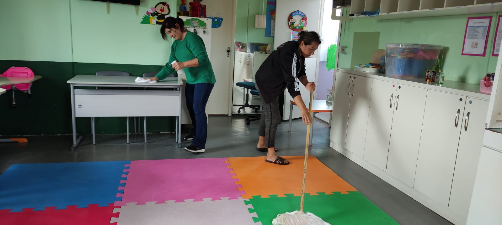 Nesta segunda-feira (9), profissionais da educação realizaram ações de limpeza nas unidades que, de uma forma ou de outra, apresentaram problemas causados pelas chuvas. A maioria dos problemas foi relacionado a goteiras, mas medidas já estão sendo tomadas para resolver a situação.