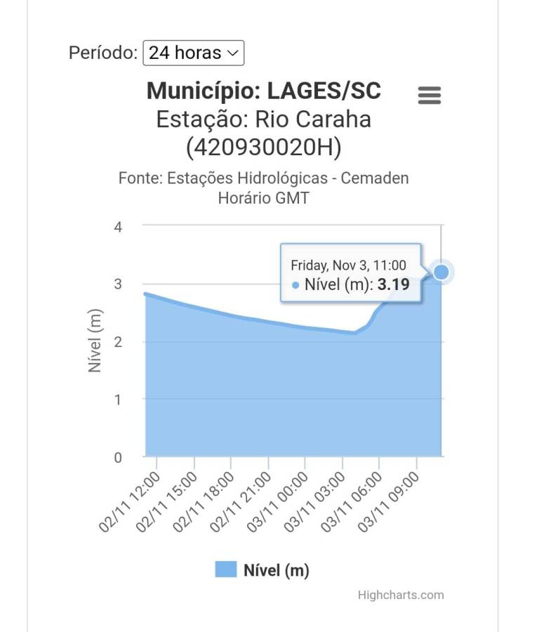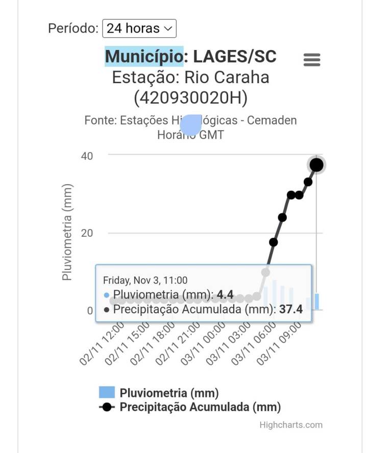 A Defesa Civil Municipal está monitorando as condições climáticas, que apontam precipitação pluviométrica de 37.4 mm nas últimas 24h. O registro foi feito às 9h desta sexta-feira (03), sendo que na estação hidrológica a medição do Rio Carahá apontava 3,19m.
