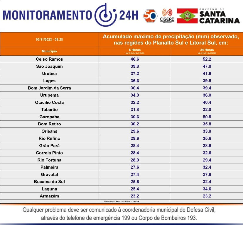 A Defesa Civil presta atendimento 24h pelo telefone de plantão (49) 99836-1702, pelo canal 199 e também pelos telefones (49) 3019-7477 e 3019-7479.