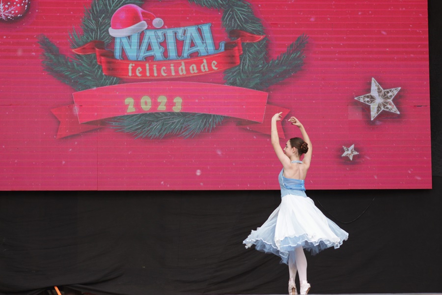 Nem mesmo o tempo instável deste domingo (10) foi impedimento para que o Natal Felicidade 2023 contasse com apresentações que encantassem o público presente no calçadão da praça João Costa. O palco do Espaço Cultural Aristiliano Ramos foi tomado pela alegria e a leveza do circo, através das coreografias trazidas pelo Studio de Ballet Liz Velho.