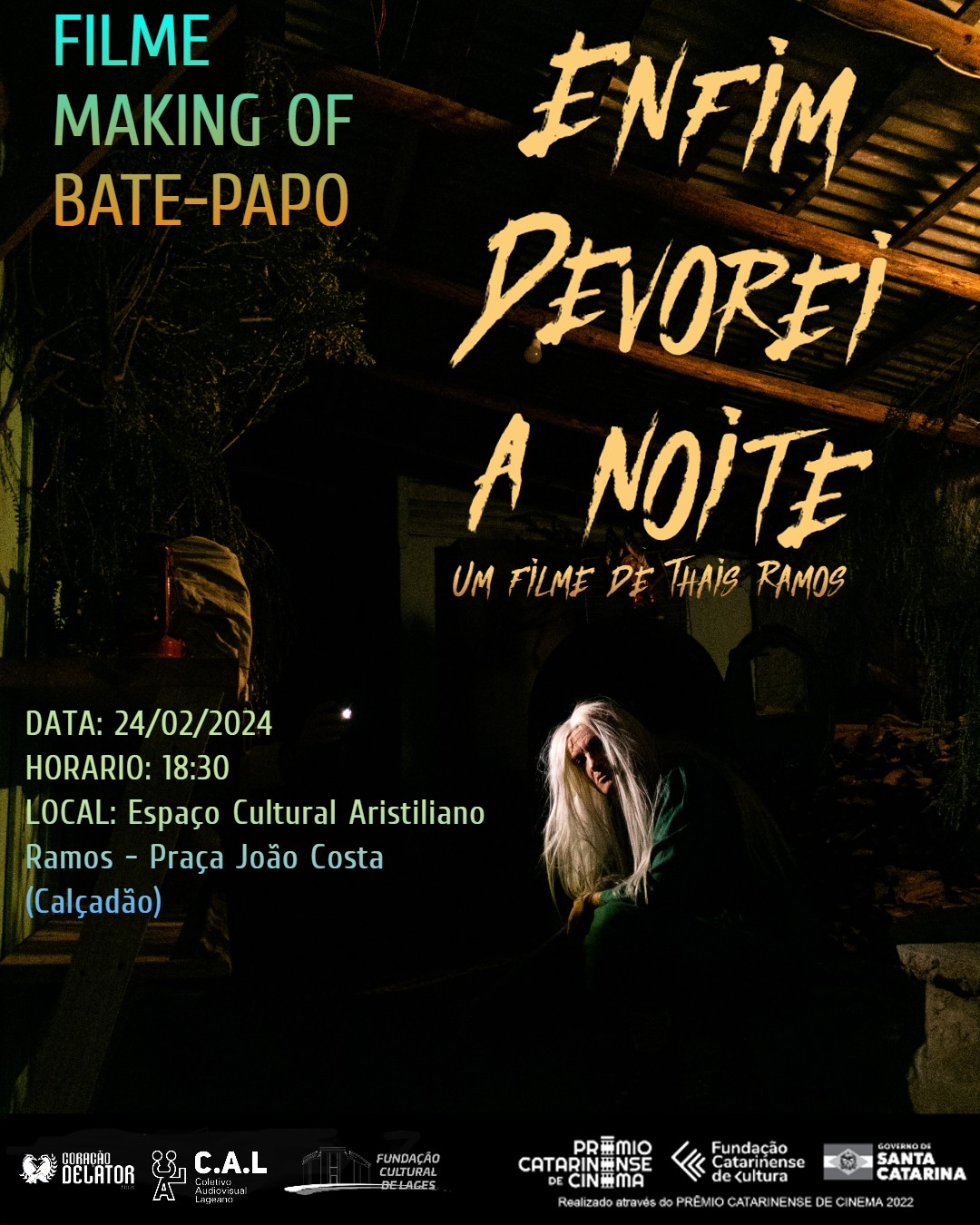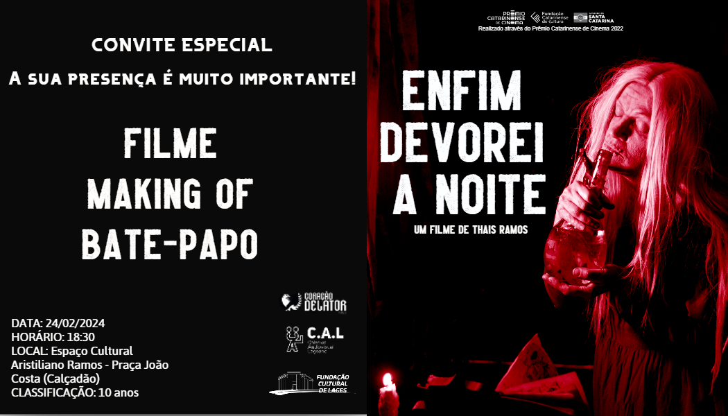 A sinopse acima é do filme “Enfim devorei a noite”, da diretora e roteirista lageana Thaís Ramos. Obra que fará sua exibição de estreia neste sábado (24) a partir das 18h30 no Espaço Cultural Aristiliano Ramos (Calçadão da Praça João Costa). O projeto foi contemplado no Prêmio Catarinense de Cinema de 2022.