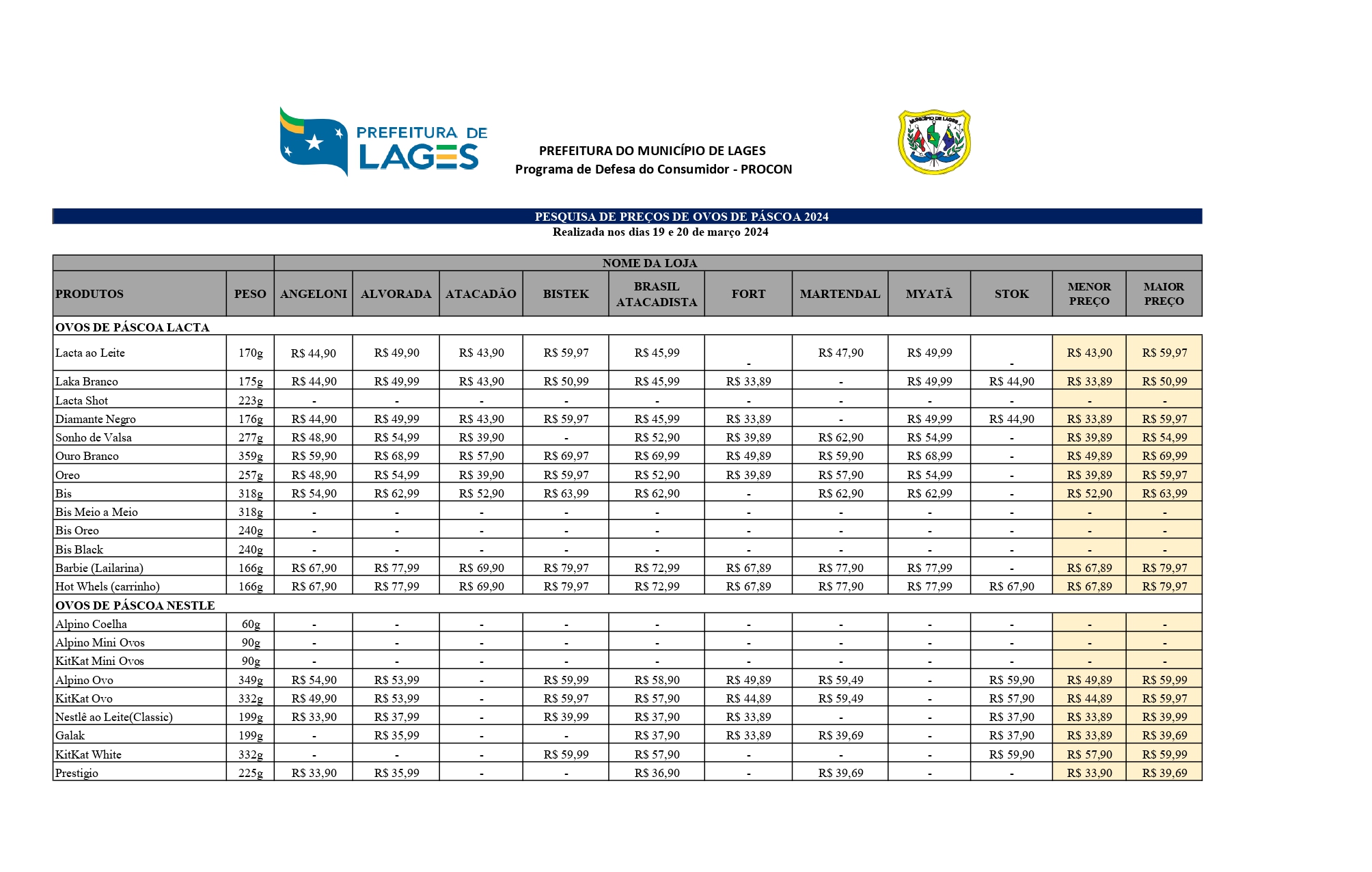 Em Lages, o Procon efetuou o levantamento nas datas de 19 e 20 de março. Os fiscais/pesquisadores selecionaram nove dos principais estabelecimentos comerciais de gêneros alimentícios da cidade - supermercados e atacadistas, em consulta a preços de ovos de Páscoa de tipos de sabores de cascas e recheios, e submarcas pertencentes as três principais e maiores marcas de ovos de chocolate do Brasil, de gramaturas variadas, de tamanhos de 166 gramas a 359 gramas, cada. Além destes itens de chocolate, o Procon pesquisou valores de caixas de bombons em quatro marcas, com pesagens de 146 gramas, 250 gramas e 251 gramas, e mais uma caixa tipo wafer recheado, de 100 gramas, em seus quatro tipos de sabores. A tabela expõe os pesos, preço em cada estabelecimento, menor valor e maior valor encontrado.