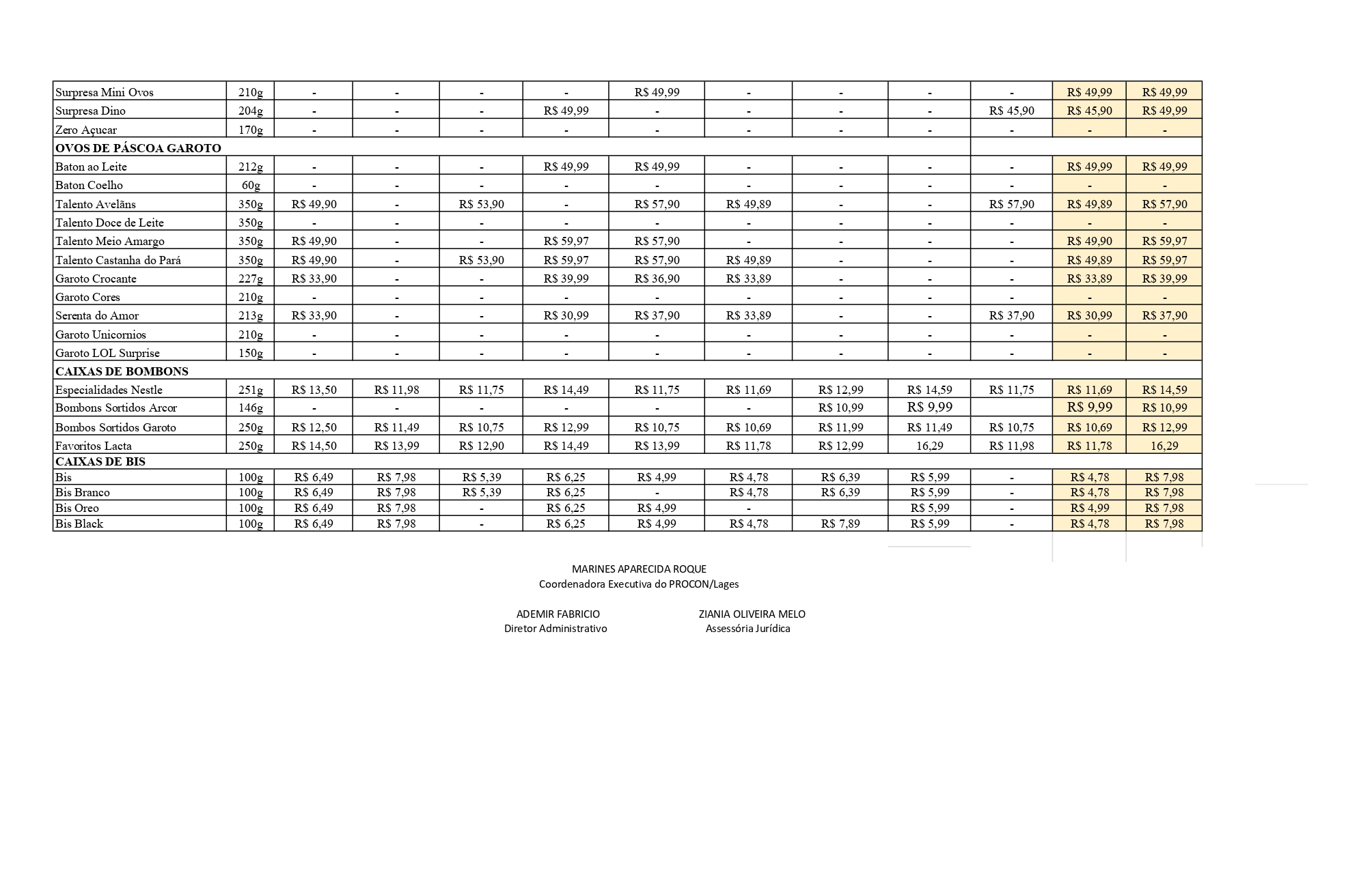 Fotos: Divulgação / Imagem tabela pesquisa: Programa de Defesa do Consumidor (Procon) de Lages/Divulgação Em âmbito de tipos, formatos e tamanhos de chocolate; em seleções especiais e comemorativas; na composição por brinquedos e elementos colecionáveis, e nos ingredientes livres de açúcar, glúten, leite e lactose, perceptível a elevação de valores