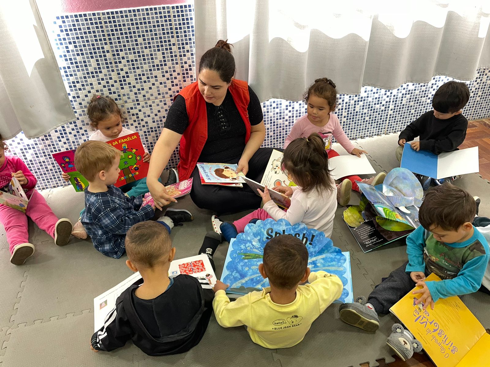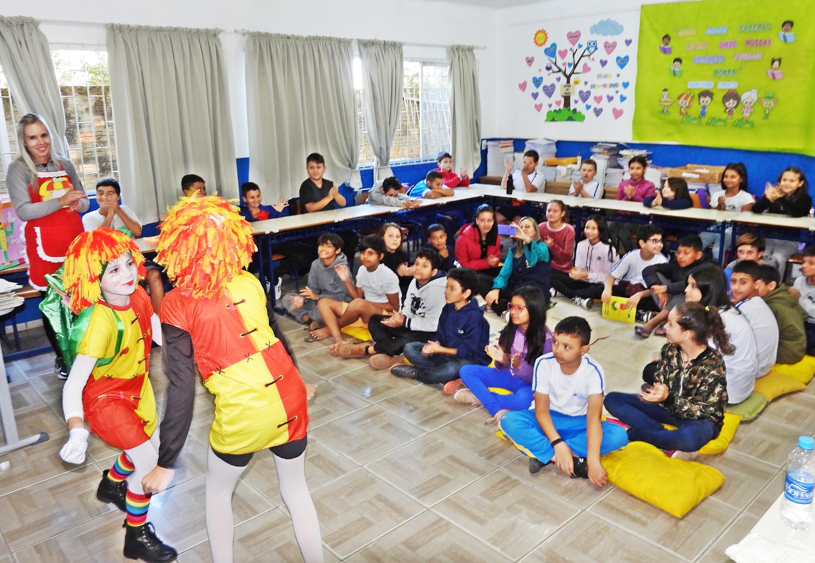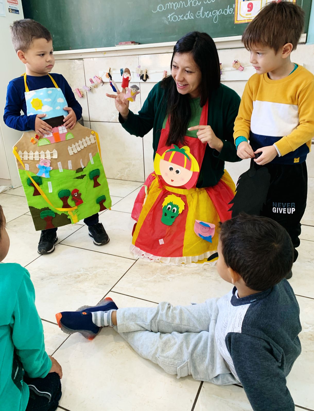 Durante as ações, as crianças e os estudantes cantaram, ouviram histórias, realizaram dramatizações e fizeram apresentações aos colegas e professoras