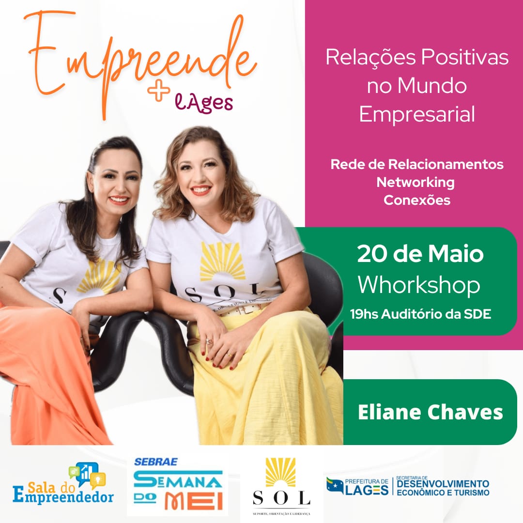 20/05 - 19h - Auditório da Secretaria - Relações Positivas no Mundo Empresarial (A importância das conexões para o sucesso do empreendedor) - Instrutora: Eliane Chaves - Programa SOL