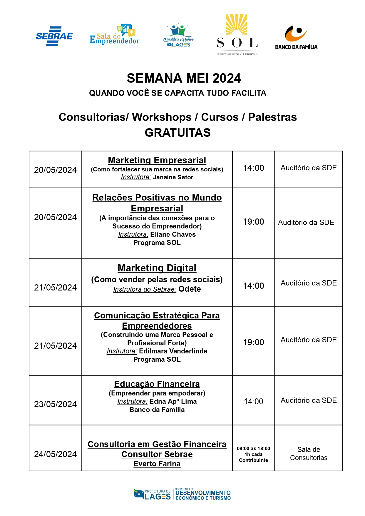 Junto à Semana do MEI, a Secretaria do Desenvolvimento Econômico e Turismo promoverá mais uma edição da campanha Empreende Mais Lages 2024, com a disponibilização de cursos e oficinas totalmente gratuitas. Os workshops serão desenvolvidos presencialmente no auditório da Secretaria. Todos os participantes terão direito a certificado.