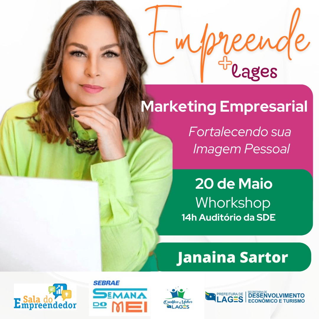 20/05 - 14h - Auditório da Secretaria do Desenvolvimento Econômico e Turismo: Marketing Empresarial (Como fortalecer sua marca na redes sociais) - Instrutora: Janaina Sartor