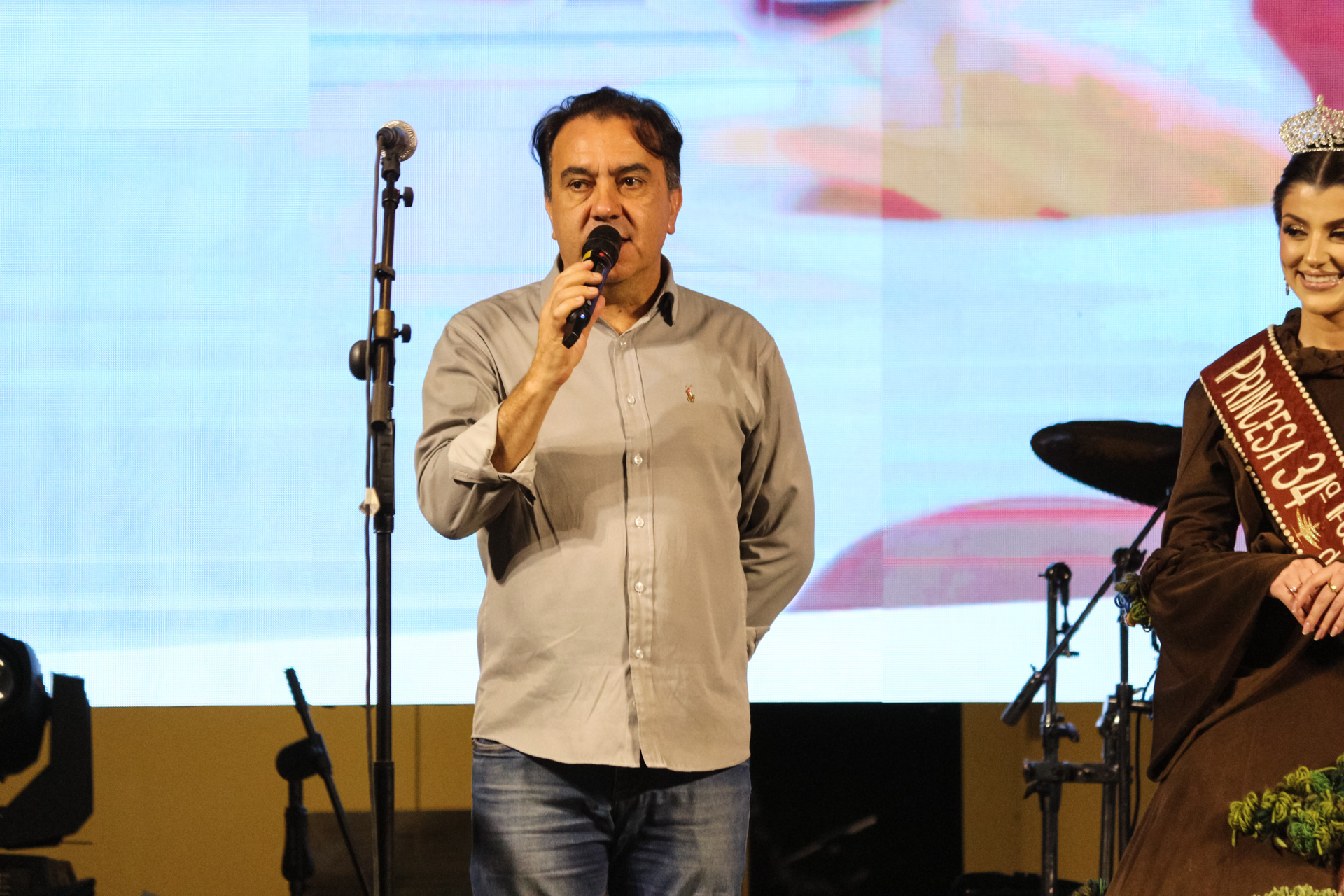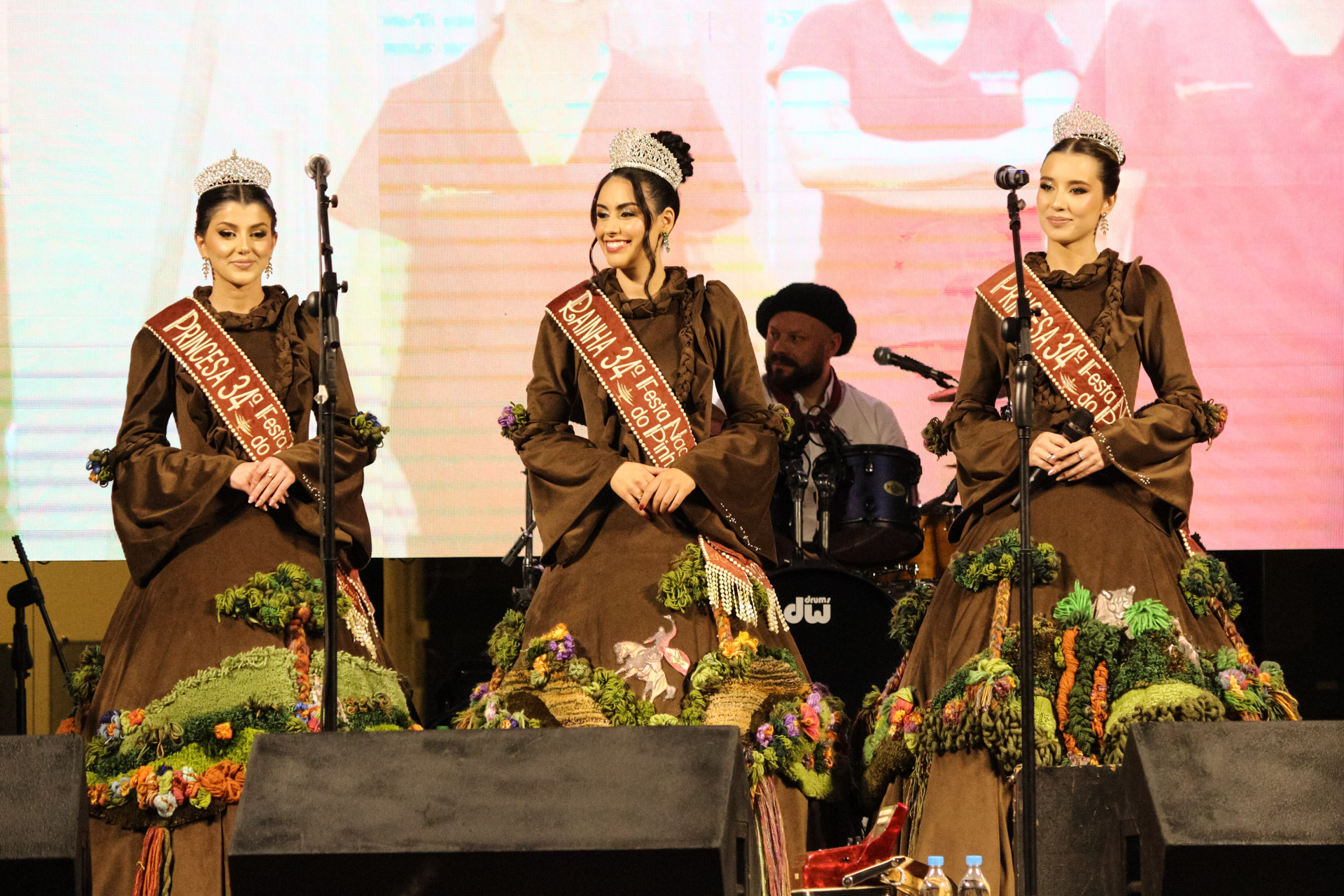 A presença da realeza também marcou a noite no Recanto. A rainha Luana Martins e as princesas Anne Machado e Emilie Vedana deixaram suas mensagens de gratidão para comunidade lageana e visitantes nesta edição da Festa do Pinhão.