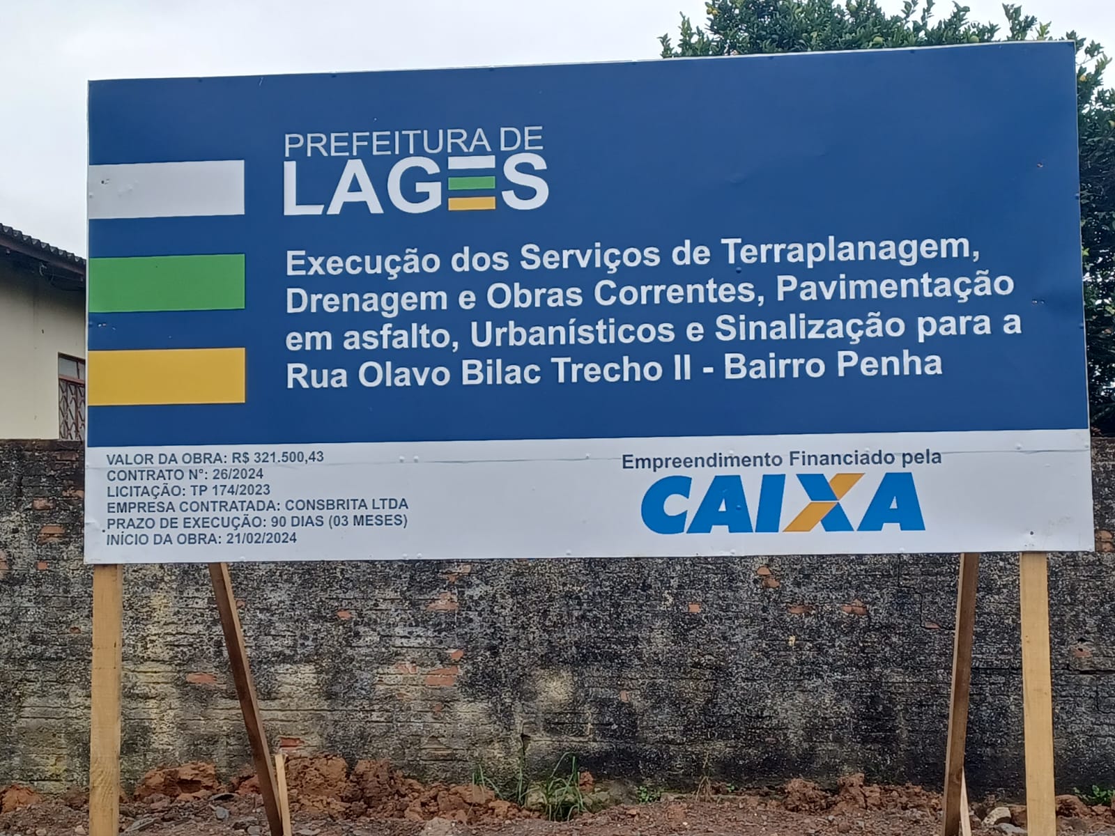 O trecho em obras da rua Olavo Bilac, no bairro da Penha, foi asfaltado em uma extensão de 172 metros. O projeto, licitado pela Prefeitura de Lages, foi executado pela Consbrita Construtora de Obras Ltda., com um investimento total de R$ 321.500,43.