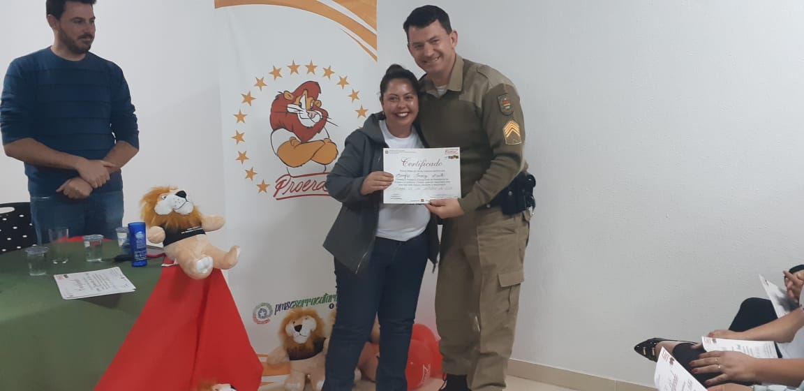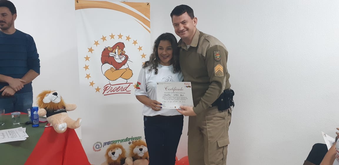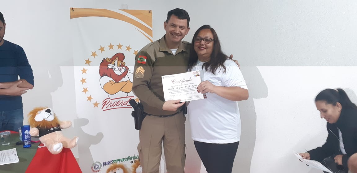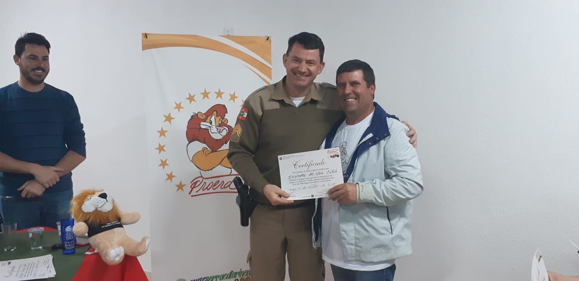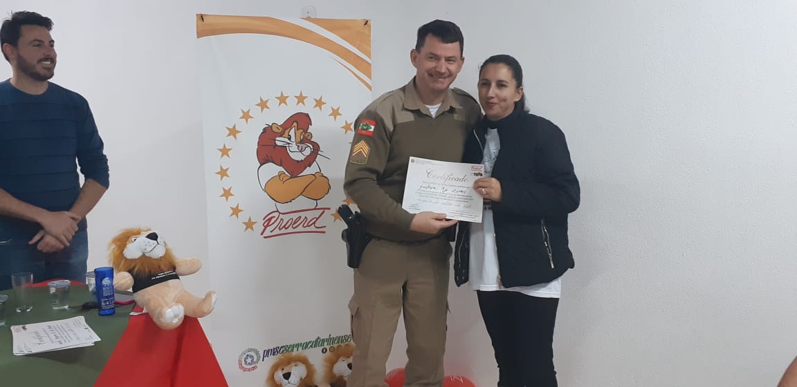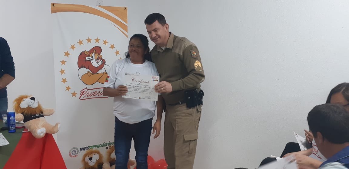 Uma noite de comemoração e confraternização. Assim foi a solenidade de formatura da turma do Programa Educacional de Resistência às Drogas e à Violência, o Proerd Pais, nesta terça-feira (15 de outubro) nas dependências do 6º Batalhão de Polícia Militar (PM). A iniciativa envolveu a Polícia Militar de Lages e a Prefeitura, através do Centro de Referência de Assistência Social, Jandira Amorim (CRAS I, do bairro Popular). Os cerca de 20 formandos são pais e mães das crianças e adolescentes que participam das atividades deste equipamento de assistência social e do território de abrangência.