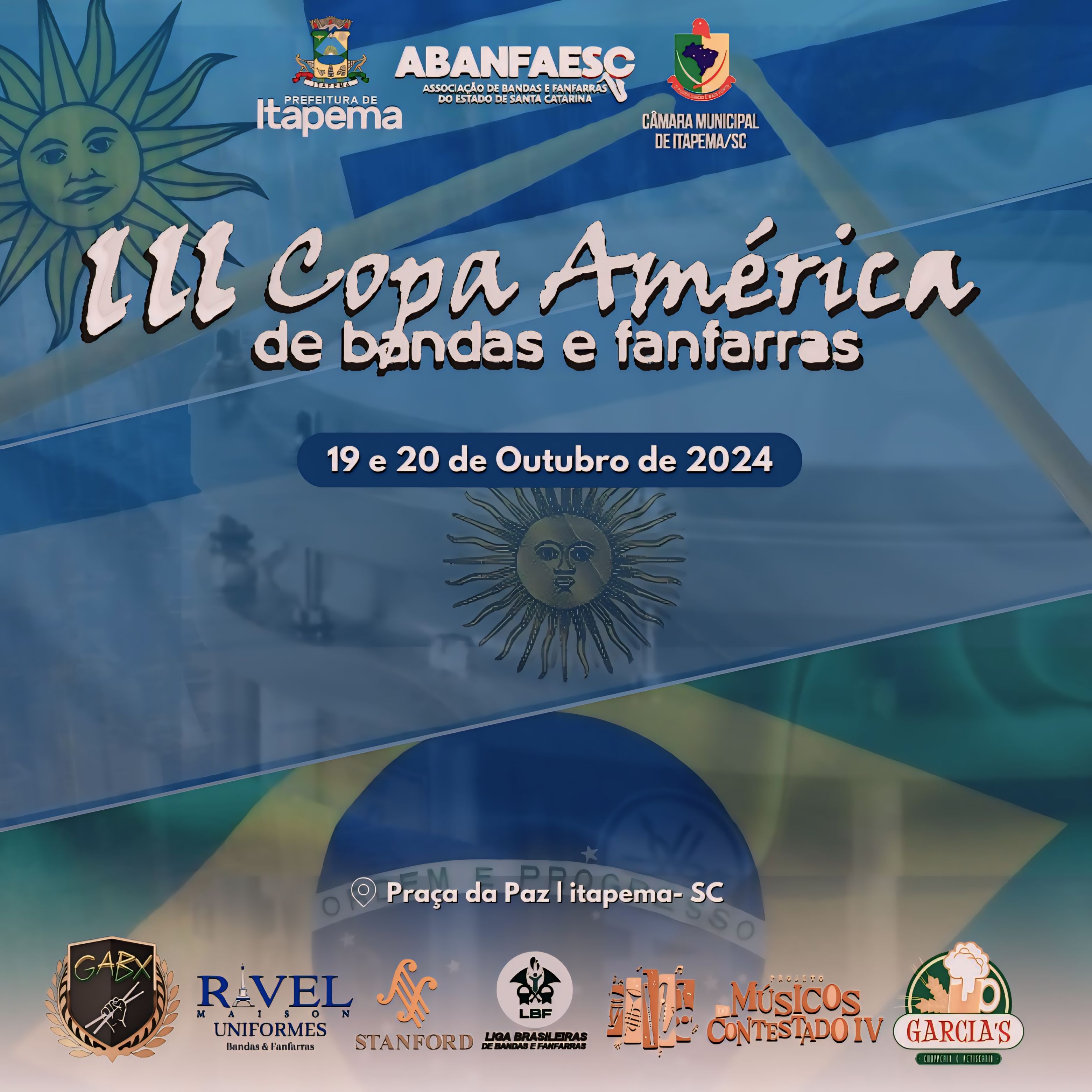 A terceira edição da Copa América de Bandas e Fanfarras acontece neste fim de semana, nos dias 19 e 20 de outubro na cidade de Itapema, em Santa Catarina. O evento é promovido pela ABANFAESC (Associação de Bandas e Fanfarras do Estado de Santa Catarina) e pretende reunir cerca de 60 corporações de muitos estados do Brasil. Serão avaliados: Mor de Comando, Baliza, Corpo Coreográfico, Pelotão de Bandeiras, Estandarte e Corpo Musical.