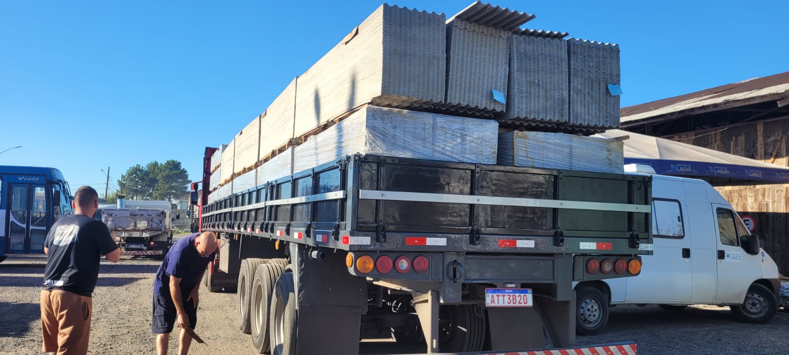 Uma nova remessa, com três caminhões carregados com oito mil unidades de telhas de fibrocimento chegou nesta madrugada de sábado (4) no pátio da Secretaria do Meio Ambiente. Por volta das 7 horas da manhã as cargas começaram a ser organizadas para que a distribuição fosse rápida, chegando aos moradores cadastrados em diversos bairros.