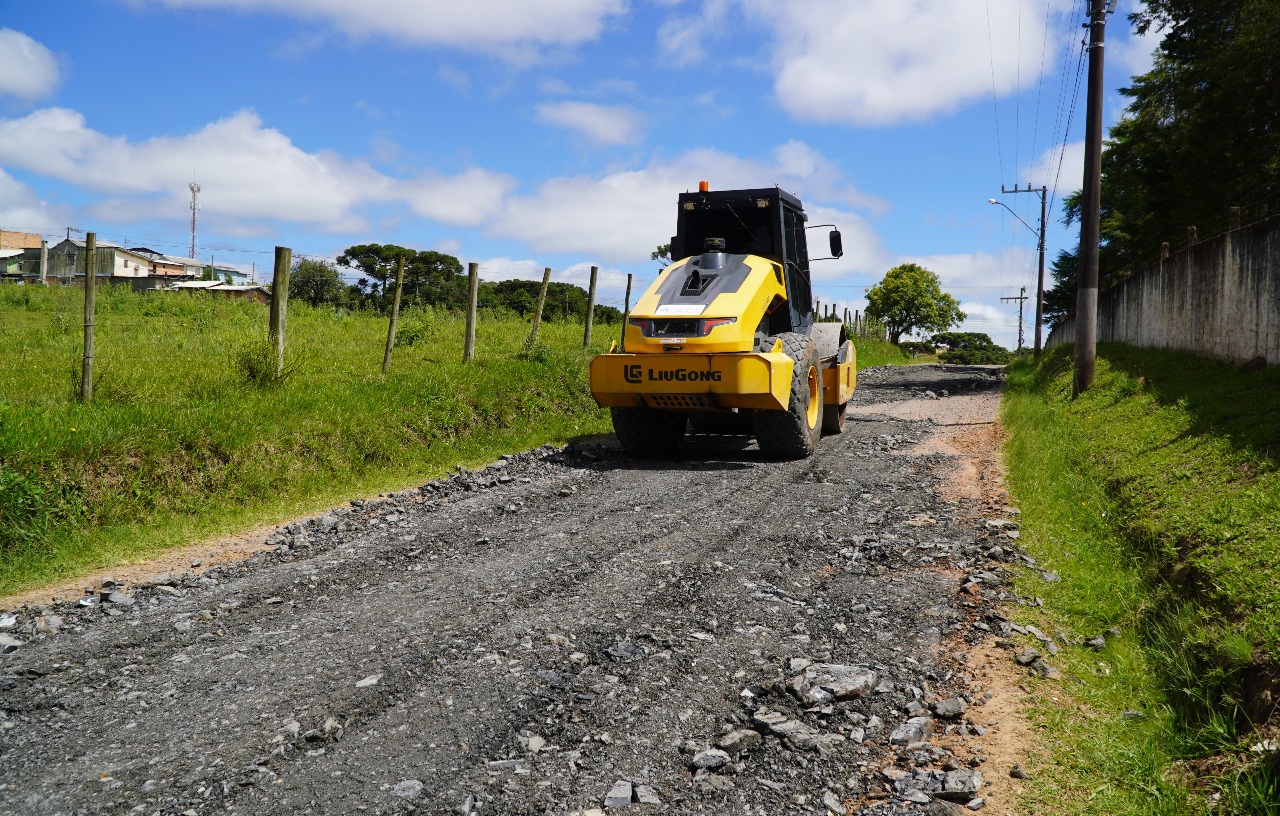 A secretaria de obras também se faz presente nos bairros, como o caso da rua Romualdo Antônio do Pilar, que liga os bairros Passo Fundo e Vila Maria, com o serviço de patrolamento e colocação de cascalhos.