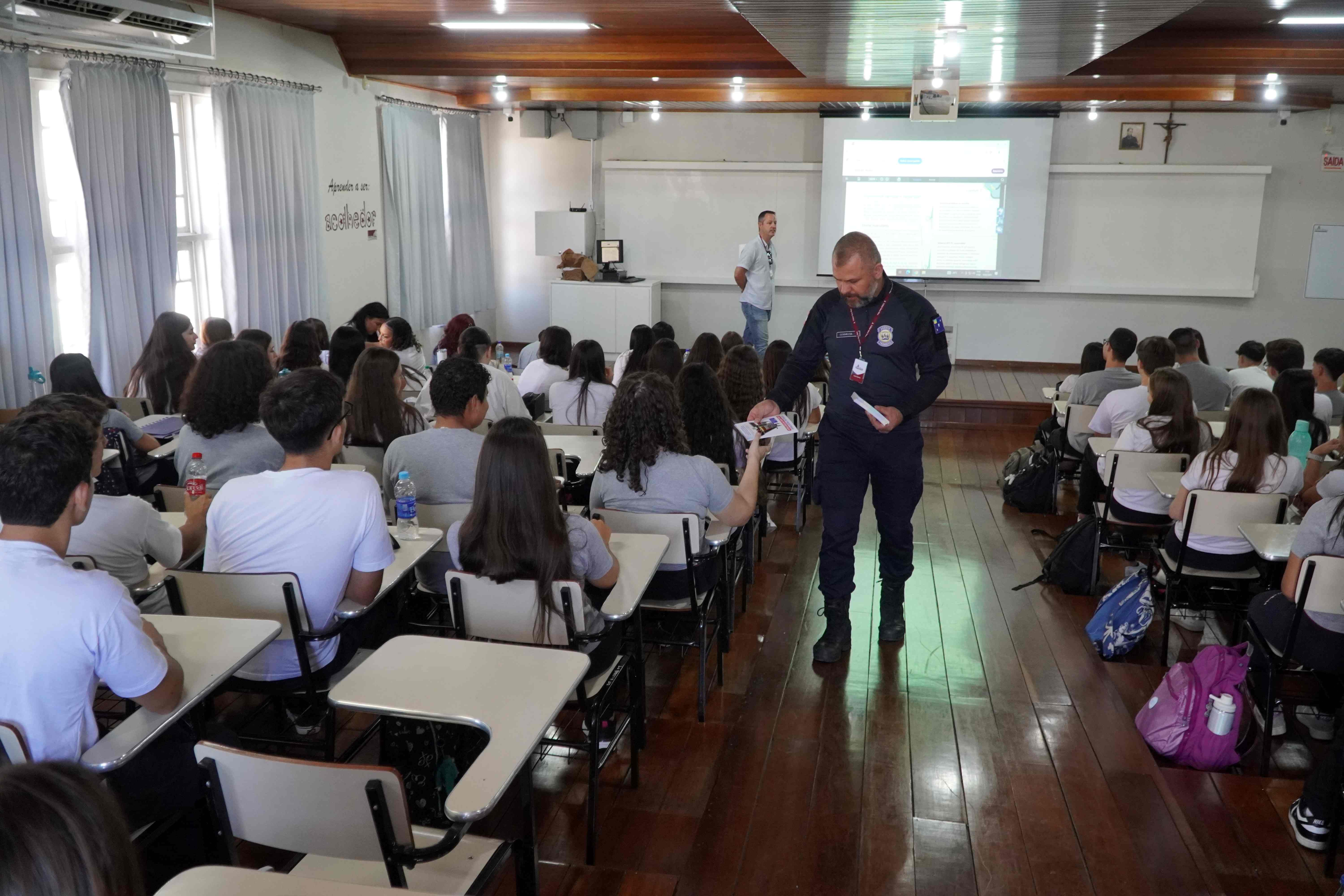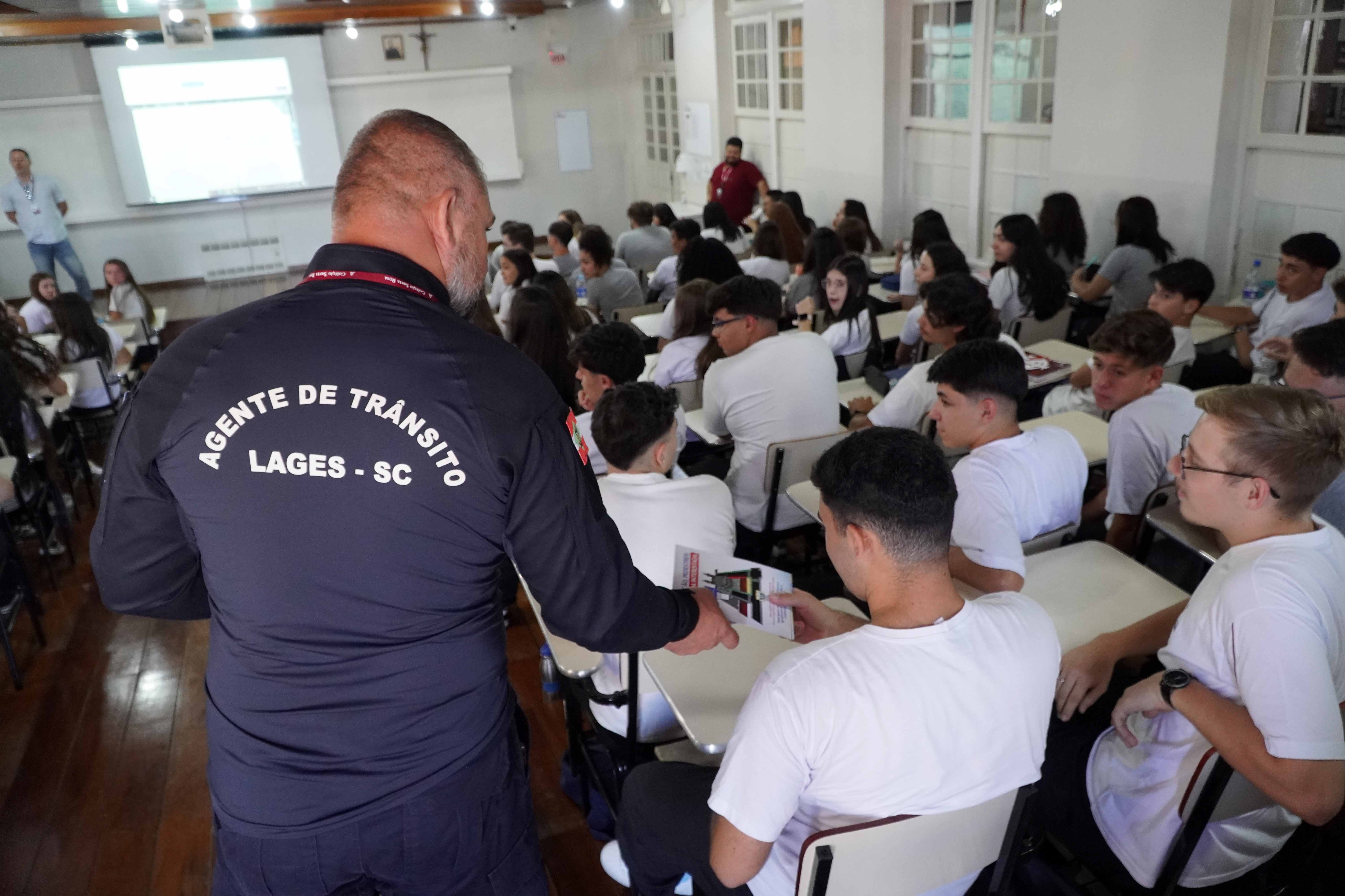 A ação informativa foi intensificada nesta semana, devido ao retorno às aulas e ao maior fluxo de pedestres que passam pela Catedral. O Diretor de Engenharia e Sinalização de Trânsito, Ricardo Fonseca Nerbass, acompanhado por um agente de trânsito, visitou os colégios Santa Rosa de Lima, Bom Jesus Diocesano, a EEB Vidal Ramos, o Cedup Renato Ramos da Silva e a Associação de Deficientes Visuais do Planalto Serrano (Adevips).