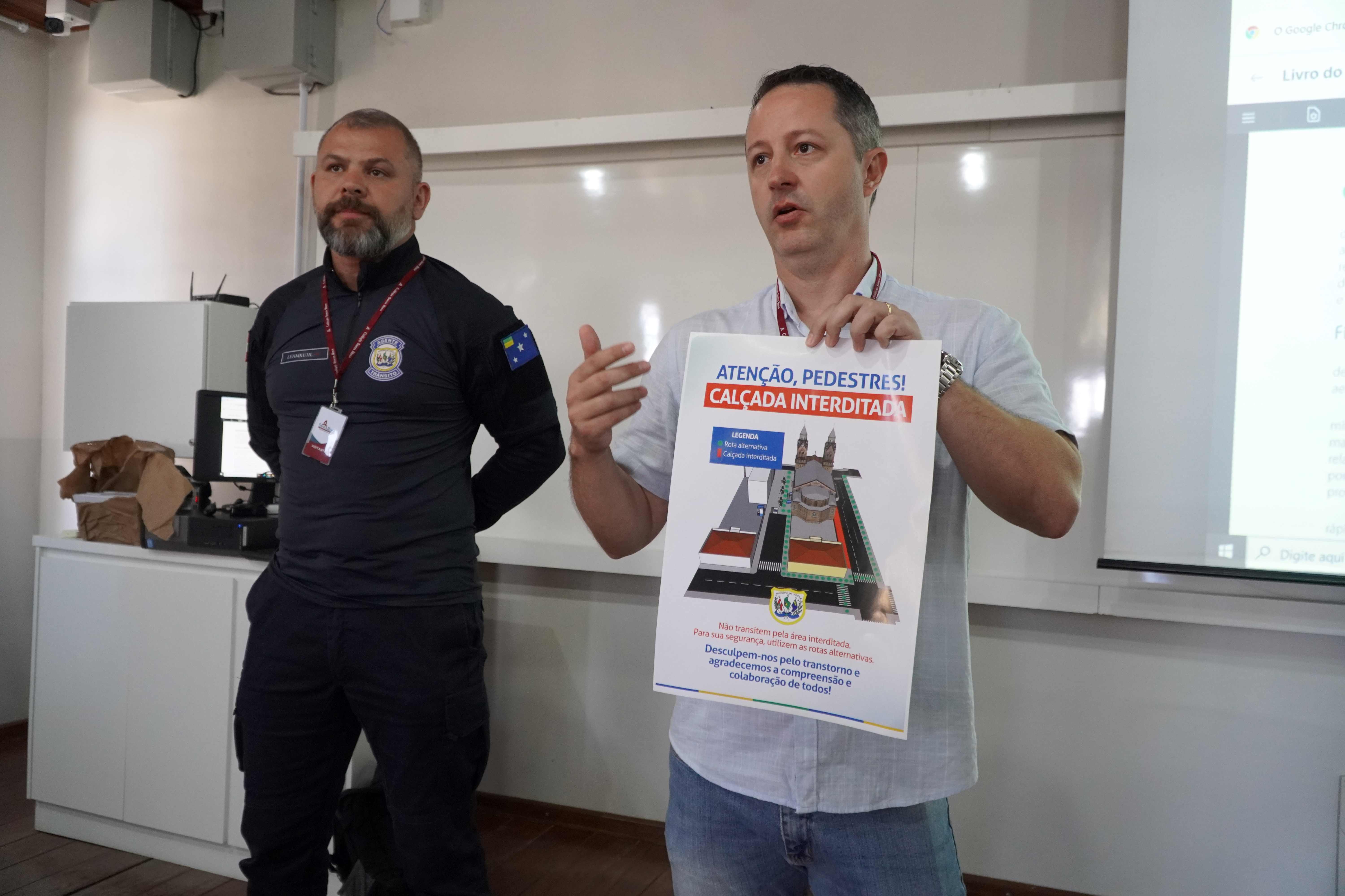 Foram entregues materiais impressos informativos sobre as alterações no trânsito, para que sejam distribuídos entre pais e alunos, além de conversas nas salas de aula diretamente com os estudantes. “Pedimos para que aquele espaço, no entorno do tapume, não seja utilizado pelos pedestres, pois existe grande risco de atropelamentos. Estivemos nas escolas explicando para os alunos e deixando bem claro para eles a situação ali no entorno da Catedral, para que procurem passar pela calçada do outro lado da rua Frei Gabirel, onde está mais seguro”, explica Nerbass.