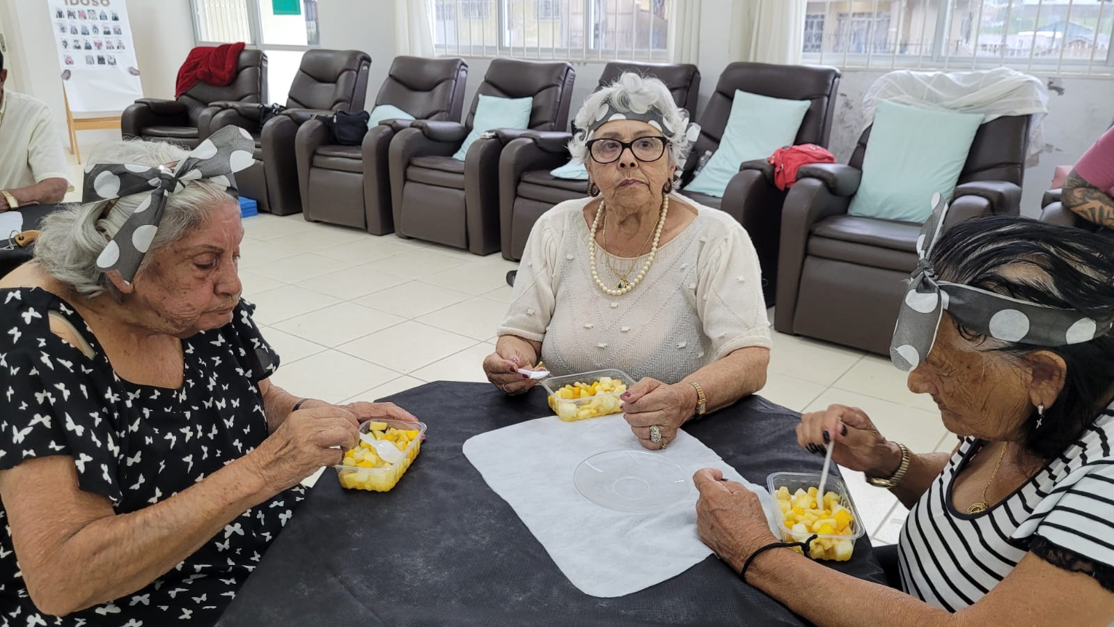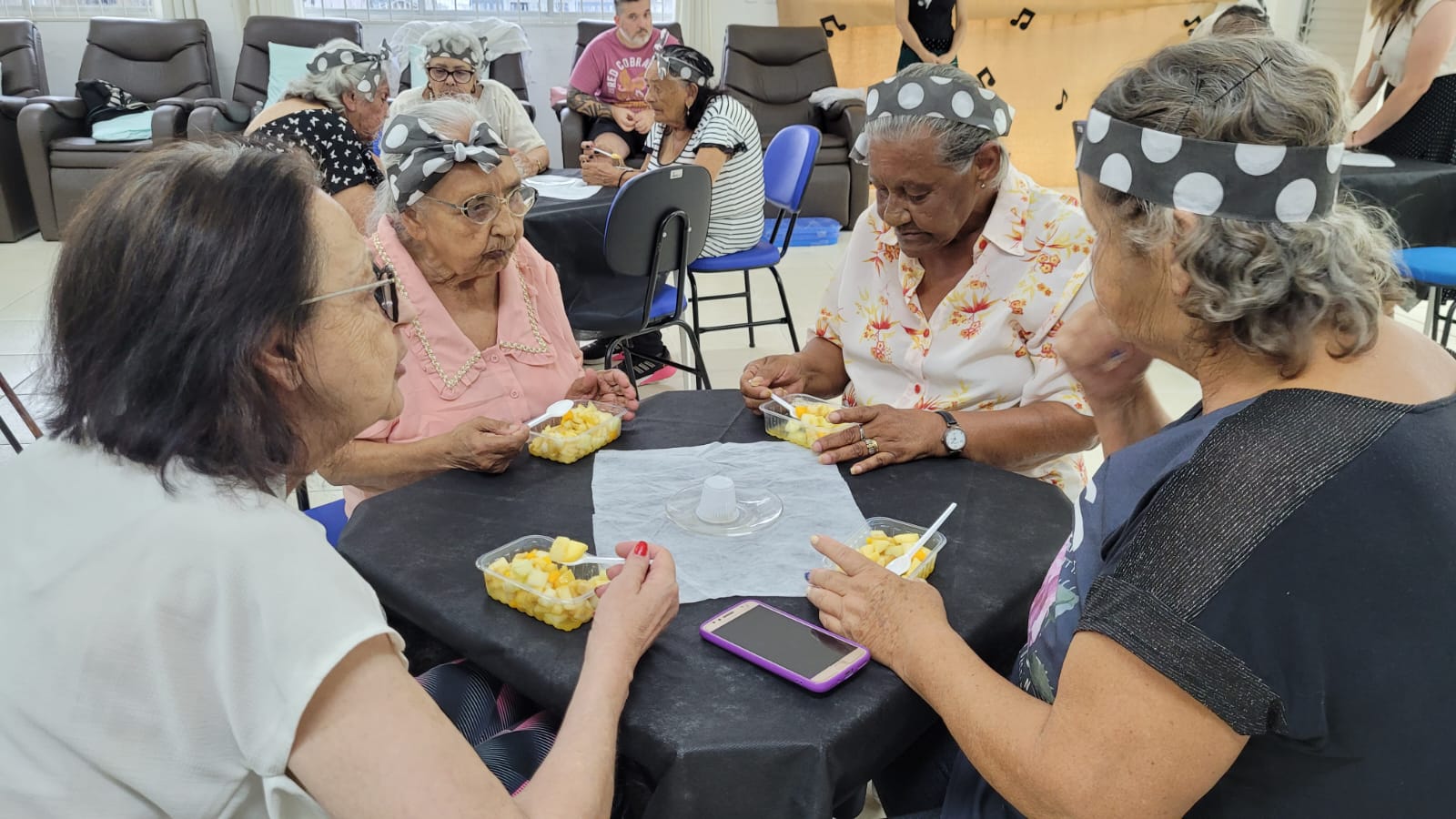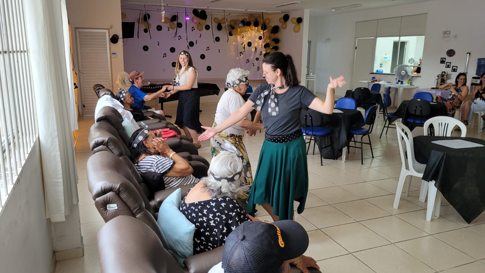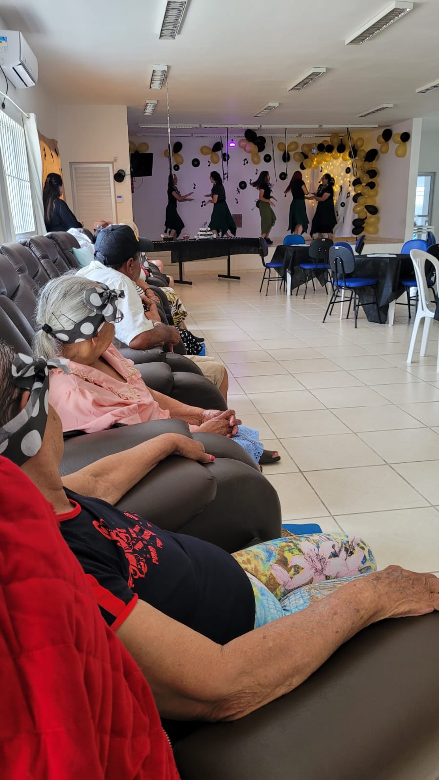 A festa teve tema “Anos 80”, com decoração alusiva, mural de fotos, balões e faixa de poá (bolinhas brancas) na cabeça para relembrar “Os Embalos de Sábado à Noite”, canções da época do vovô e da vovó, os passinhos “de antigamente” e marchinhas de Carnaval. Tudo para tornar o dia de 16 idosos inesquecível.