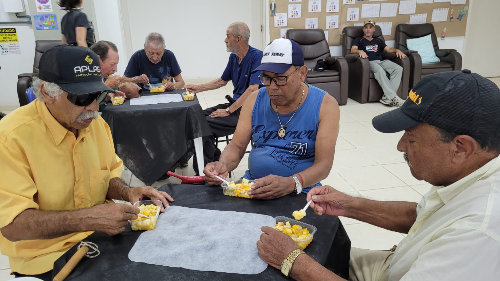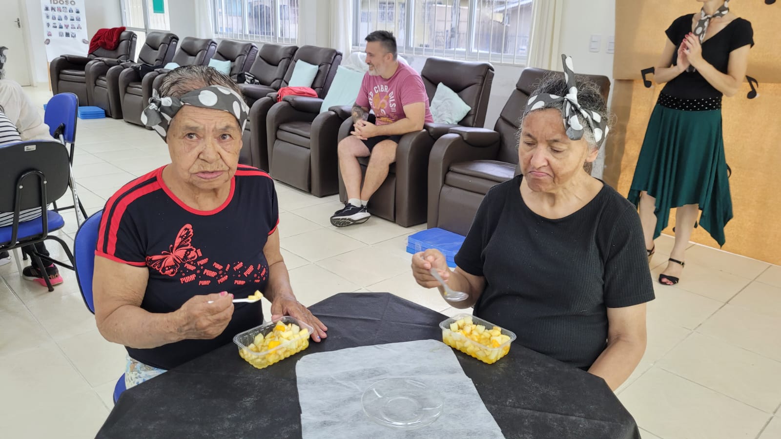 A equipe do Centro Dia do Idoso (CDI) se apresentou com coreografias, dançou junto aos idosos e fez animações durante o evento. Dançar e cantar dão fome. Então, bolos, salada de frutas e refrigerante para repor a empolgação.
