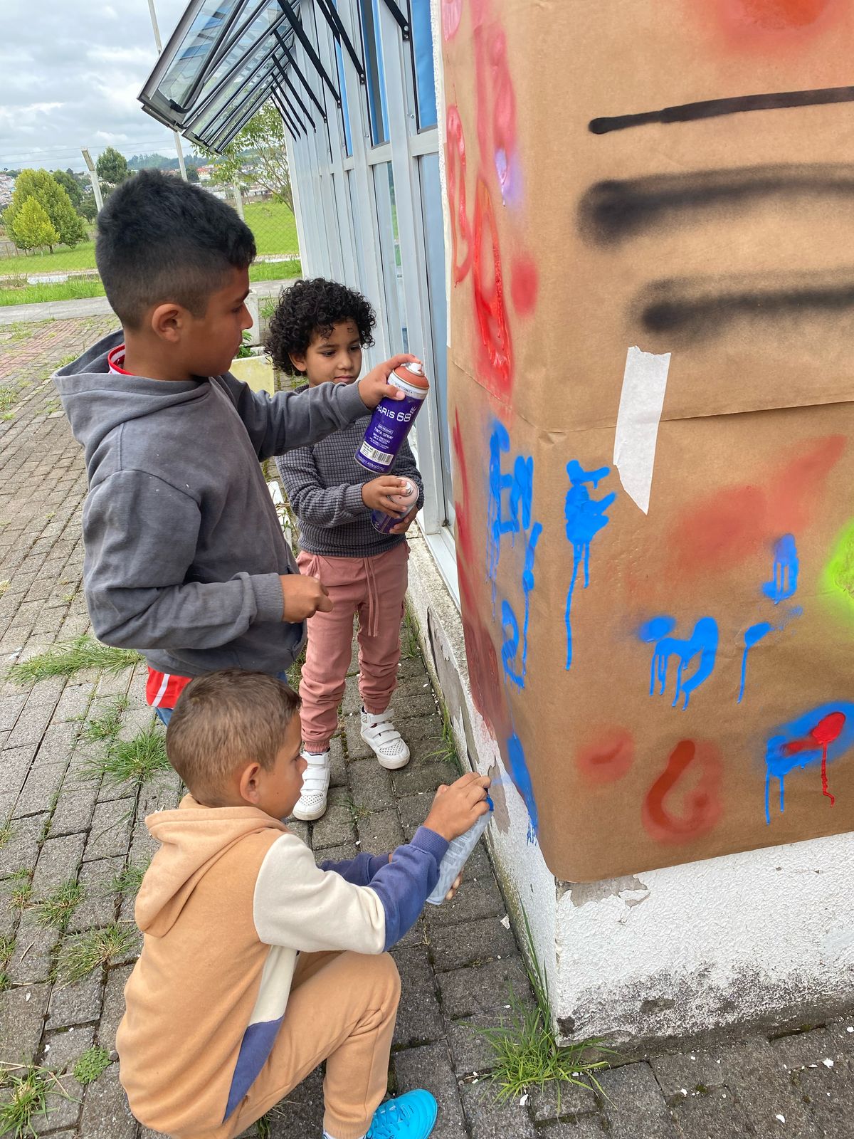 Com vivências artísticas e de valores, leituras de imagens, reflexões sobre seu papel na sociedade, percepção da realidade, expectativas de vida futura e aulas práticas de grafite, as crianças do Serviço de Convivência e Fortalecimento de Vínculos, da Secretaria Municipal de Assistência Social, fizeram grafite na Praça do CEU, localizada ao lado do complexo esportivo e ginásio Jones Minosso.